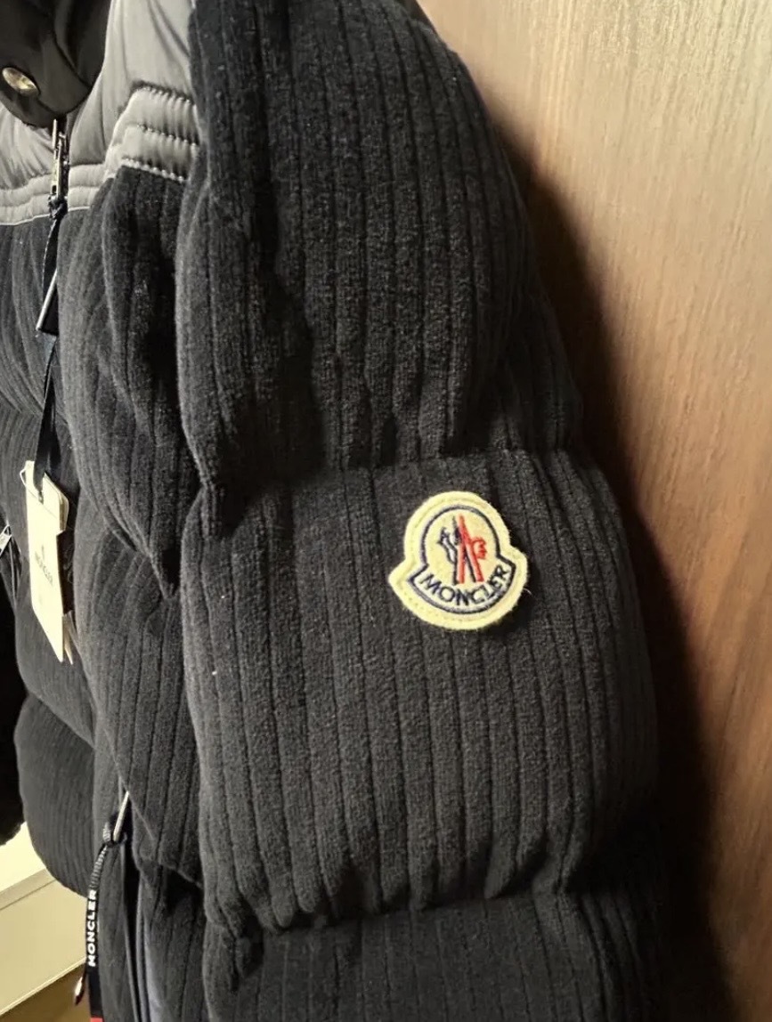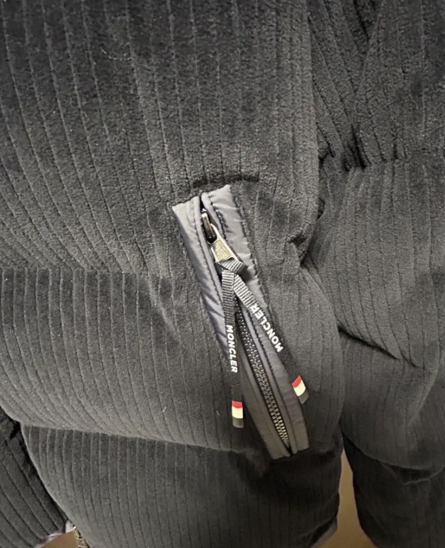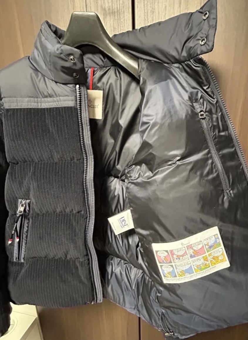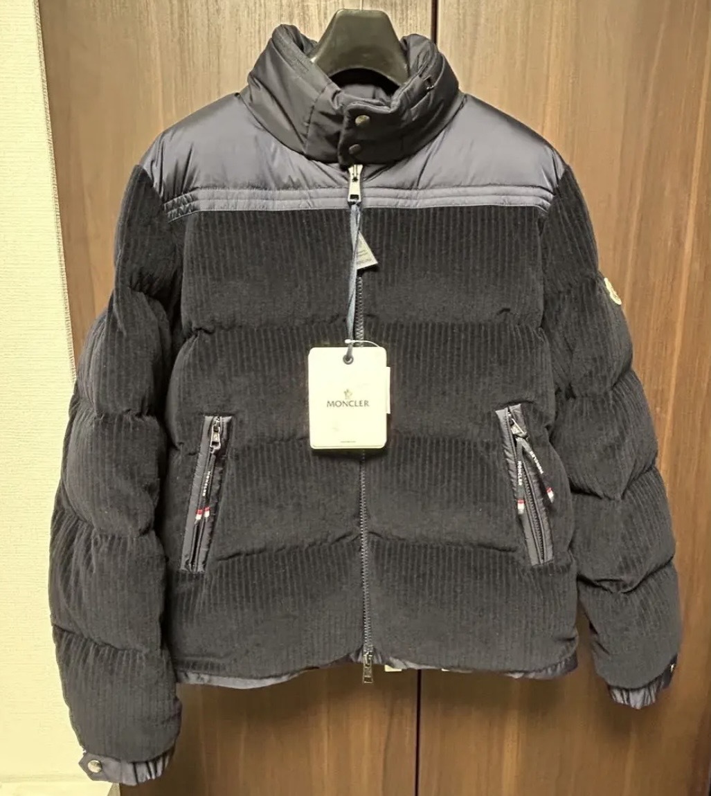 コーデュロイ/ナイロンのコンビ素材のネイビーダウンジャケット、ジッパーポケット付きで機能性も兼ね備えています。フードが襟元に収納されております。