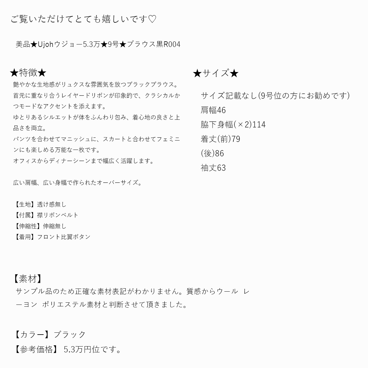 美品★素敵459★Ujohウジョー5.3万★9号★ブラウス黒R004