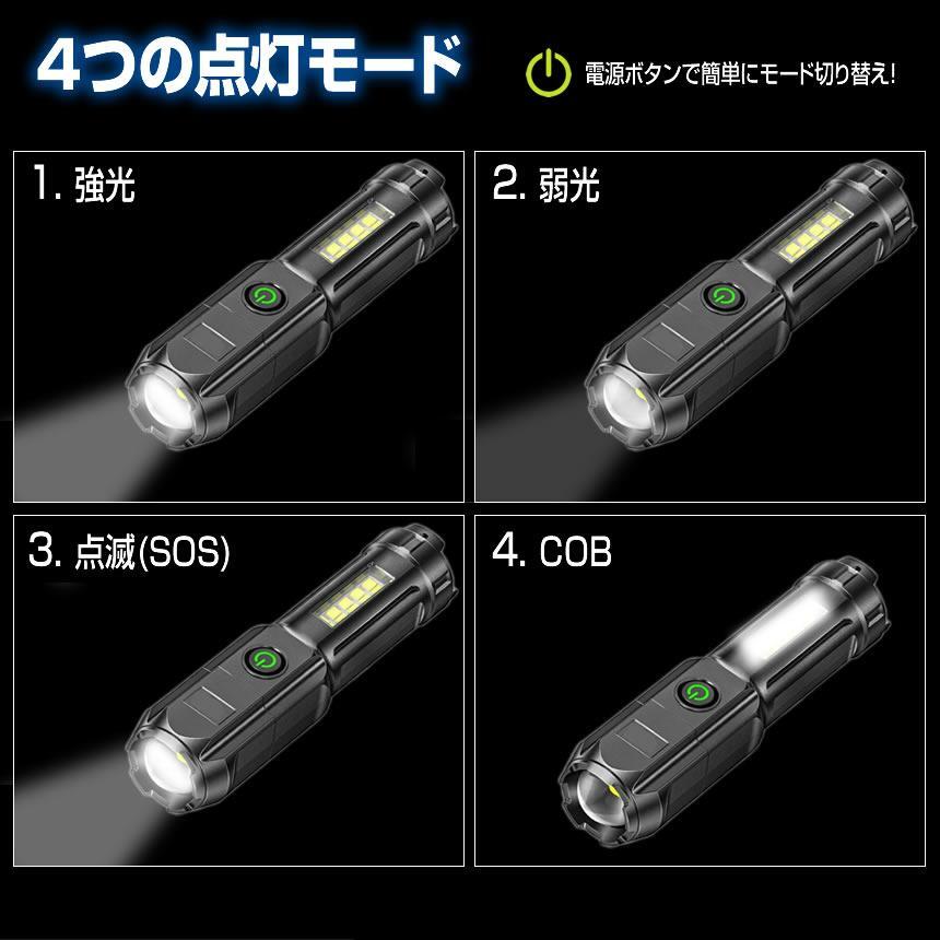 LED懐中電灯 フラッシュライト USB充電式 高輝度 4照明モード 防水 停電対策 緊急用 キャンプ