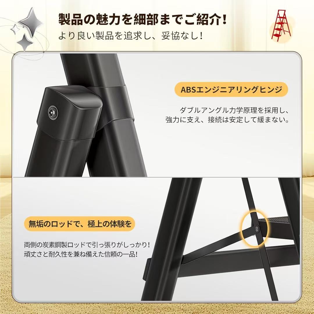 卓越した性能:特許技術による4点支持設計で、滑り止めの足がしっかりと地面を捉え、作業中に不安を感じることはありません!特別な表面処理を施した踏板は、滑りにくく、使用時の信頼性を向上させます。雨の日でも問題なく使用できます。