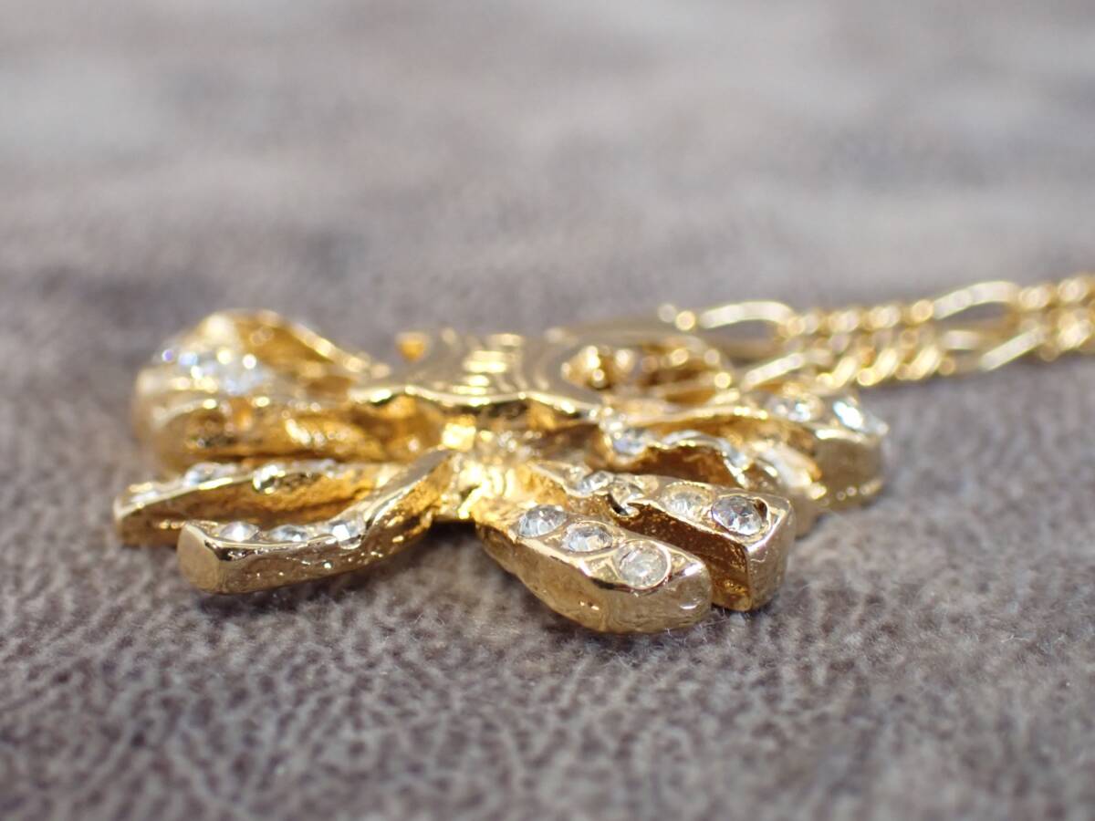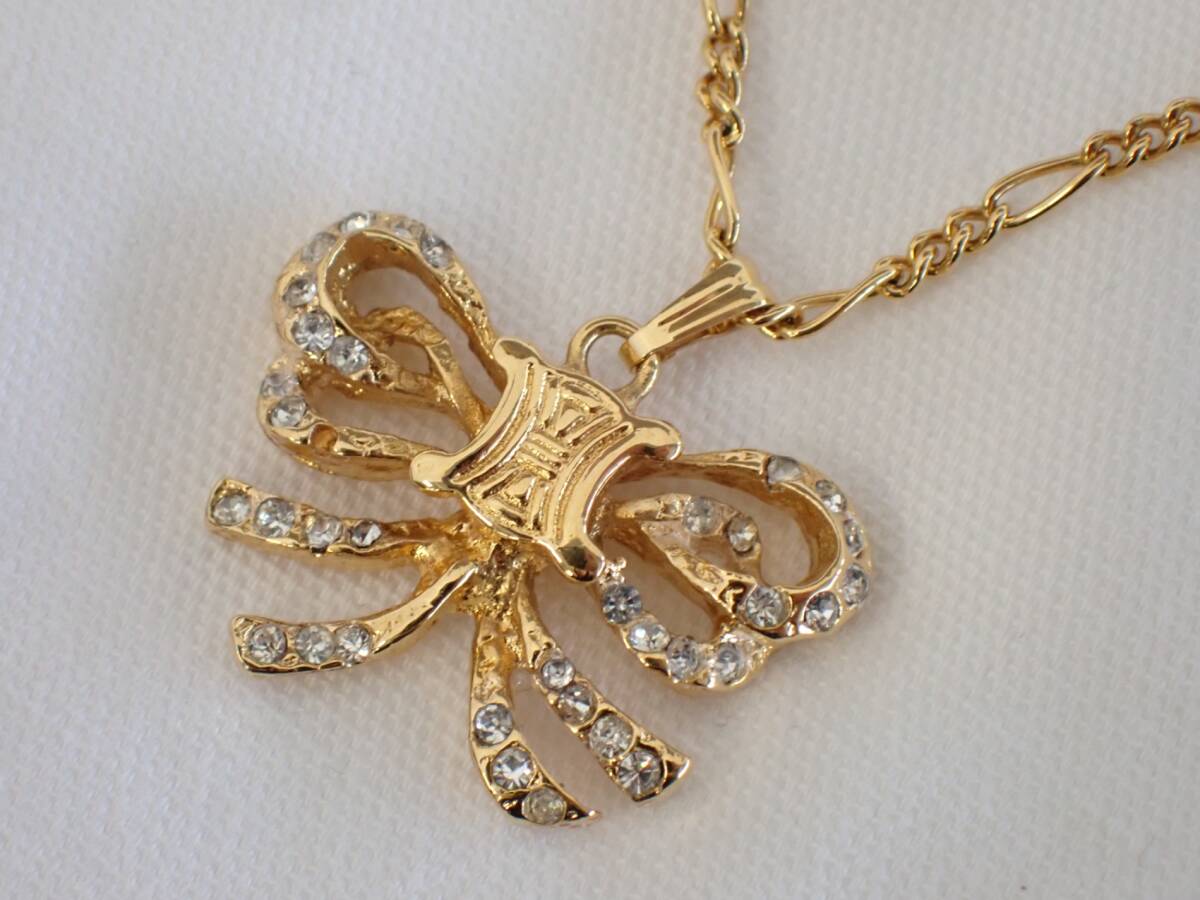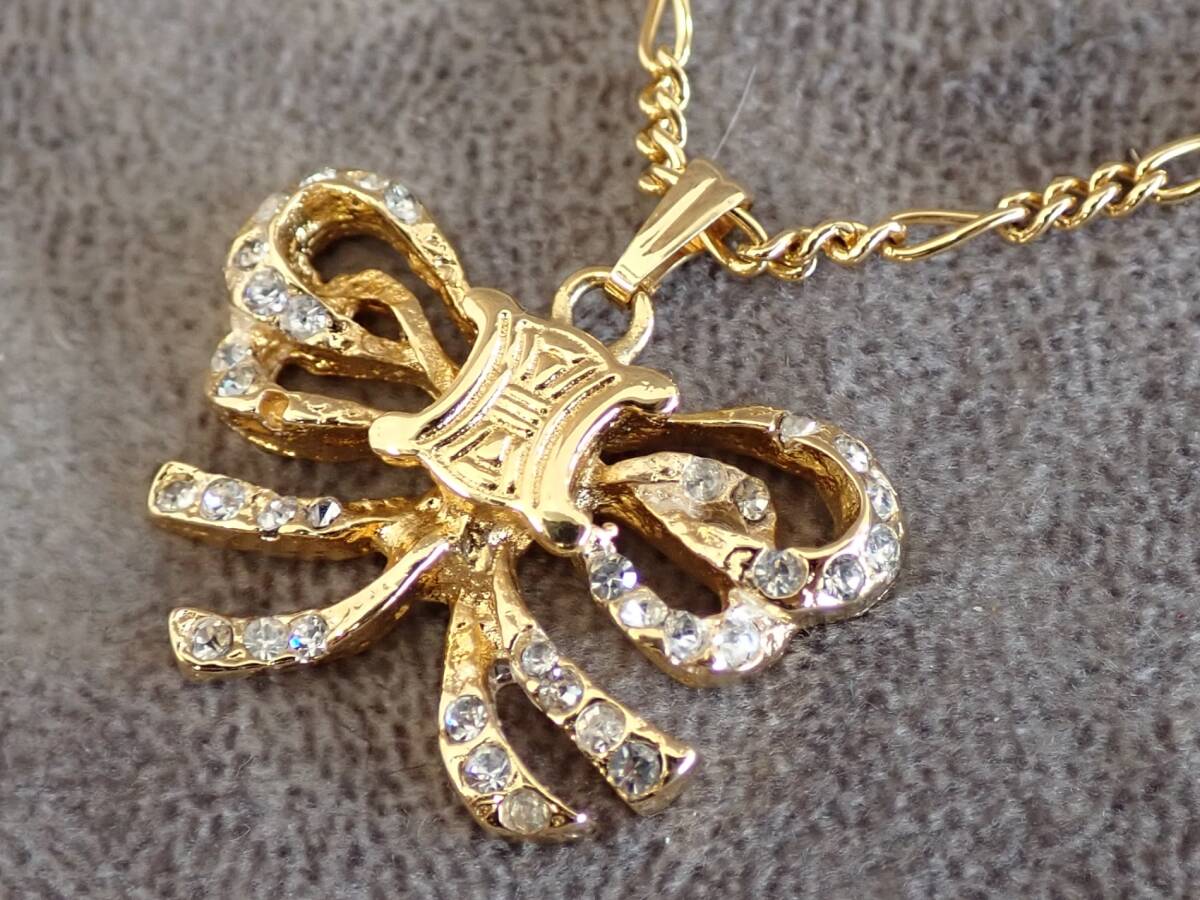 | コメント | 状態も良いコンディションです。リボンのモチーフにラインストーンが施されたネックレスです。1カ所ラインストーンに欠けがございますので、ご注意ください。欠けが1カ所ございますが、その他のラインストーンは鮮やかな輝きを保っております。裏側にも刻印がございますので、写真をご確認ください。露出の増えるこの夏の時期にピッタリなネックレスです。首元を華やかに演出してくれます。 | |
