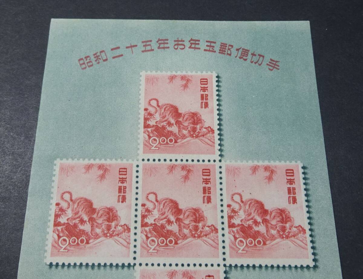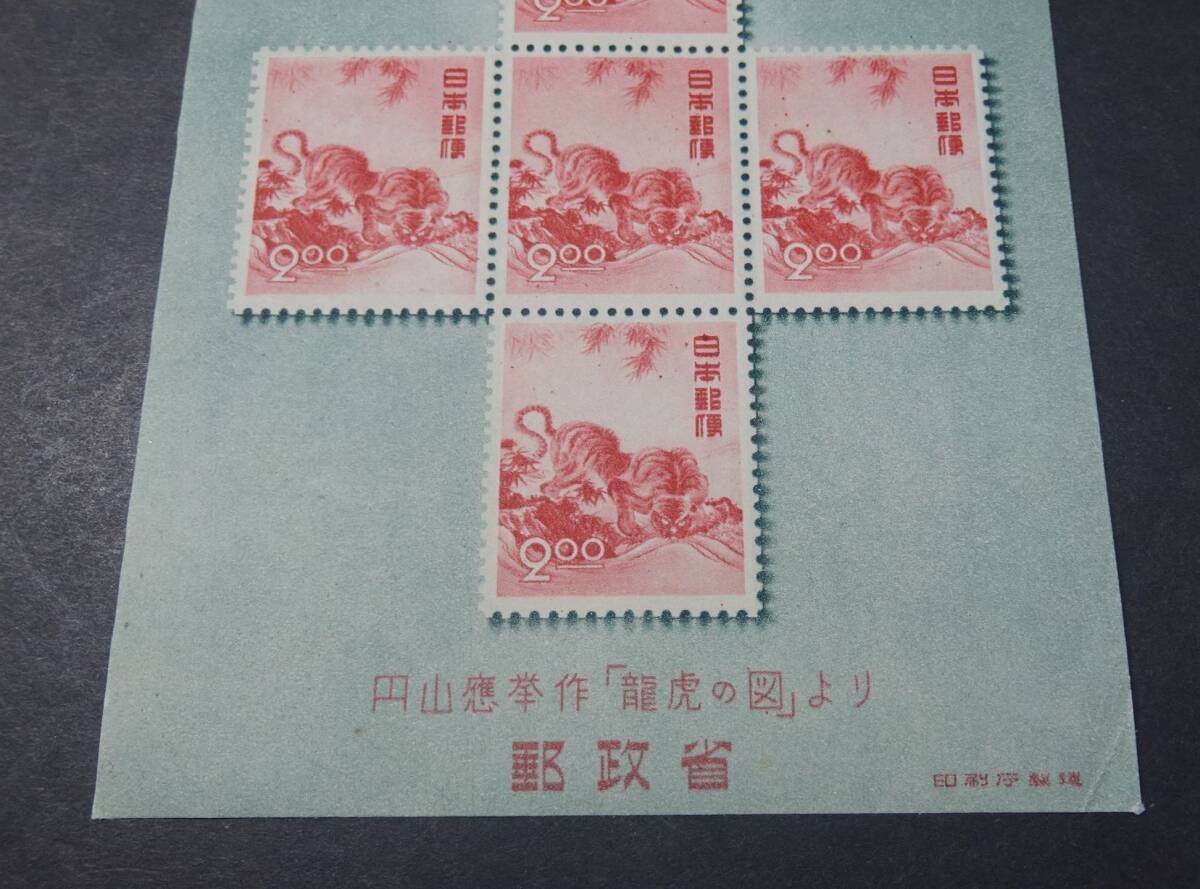 ◆商品説明◆ | ◆昭和25年用年賀切手小型シート「とら」(未使用NH・裏糊有り) ◆糊ツヤ良好ですが、年代物のためヤケ・シミ・シワ等がありますので、商品の状態は画像にてご確認ください。(角折れ跡有り) |