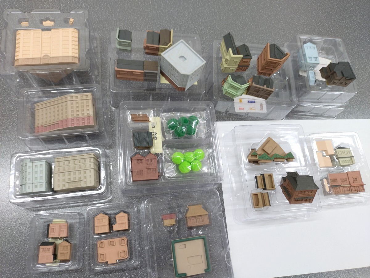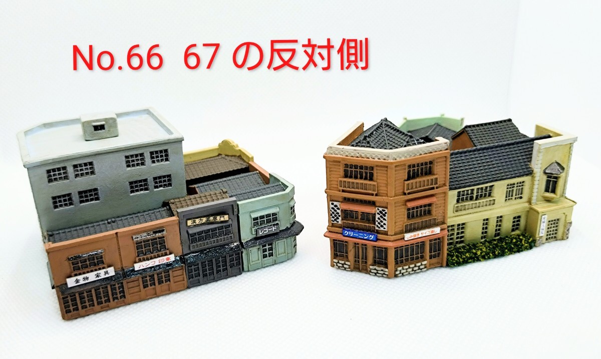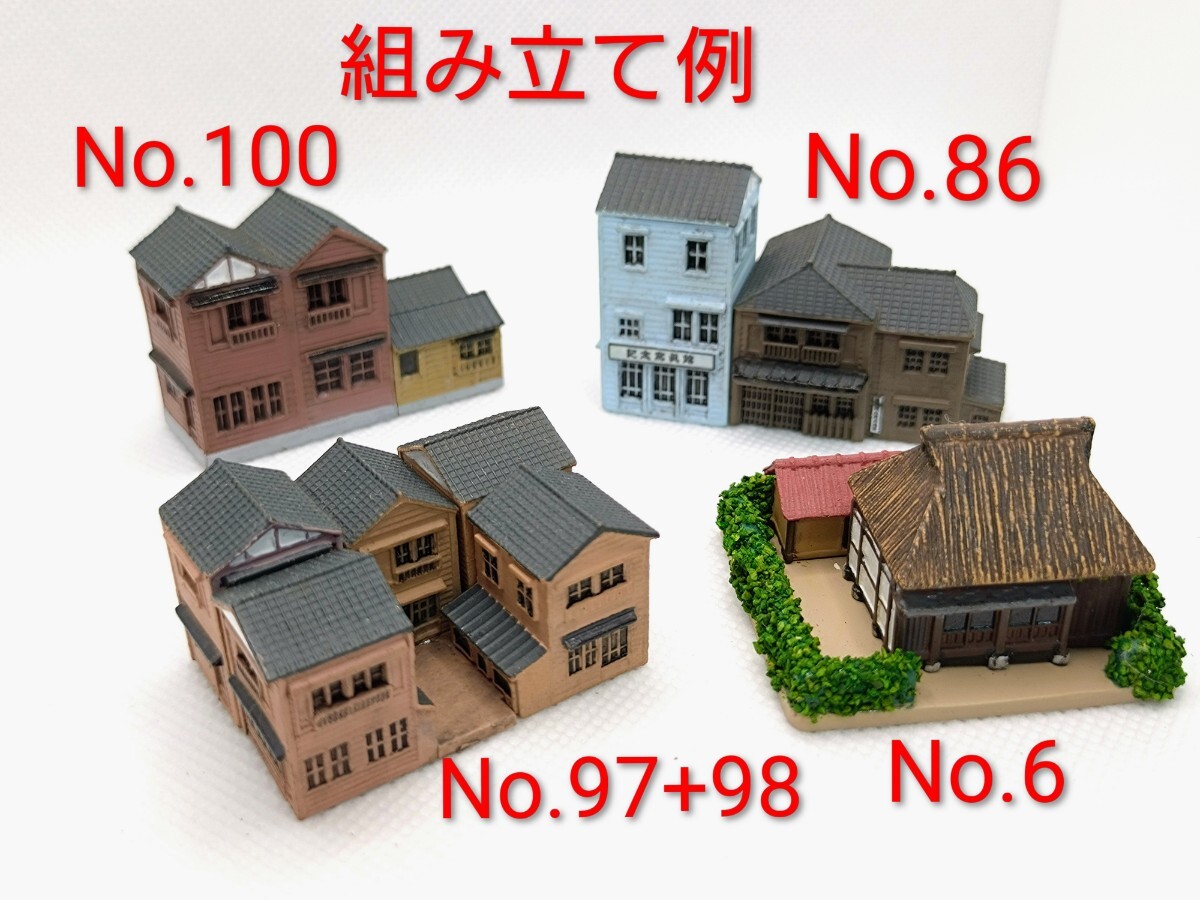 農家(6)、都会のビル(7)、都会のビル群(20+21)、里山の商店街A(22、相方となる23は欠)都会の商店(45、相方となる44は欠)、都会の商店群(66)、都会の商店群(67)下町の建物群(86) 下町の建物群(97-98)、下町の建物群F(100)。