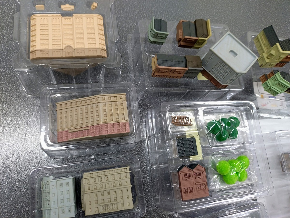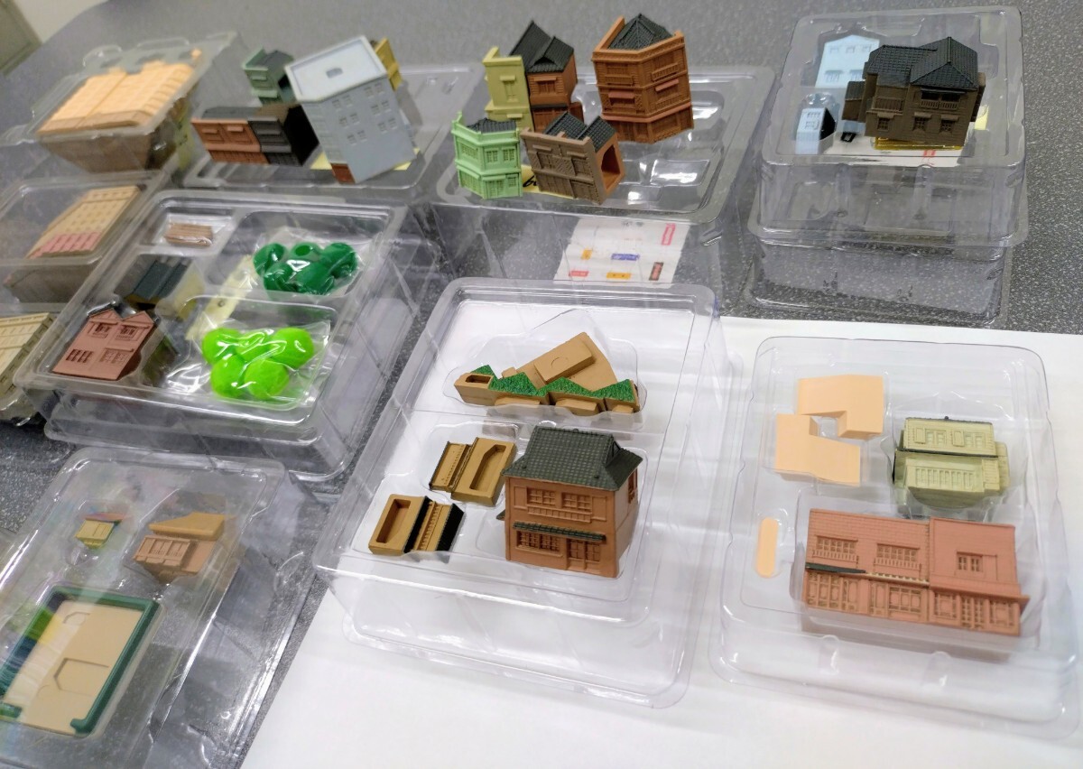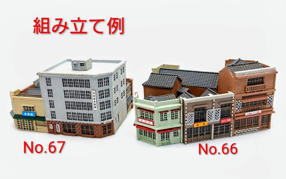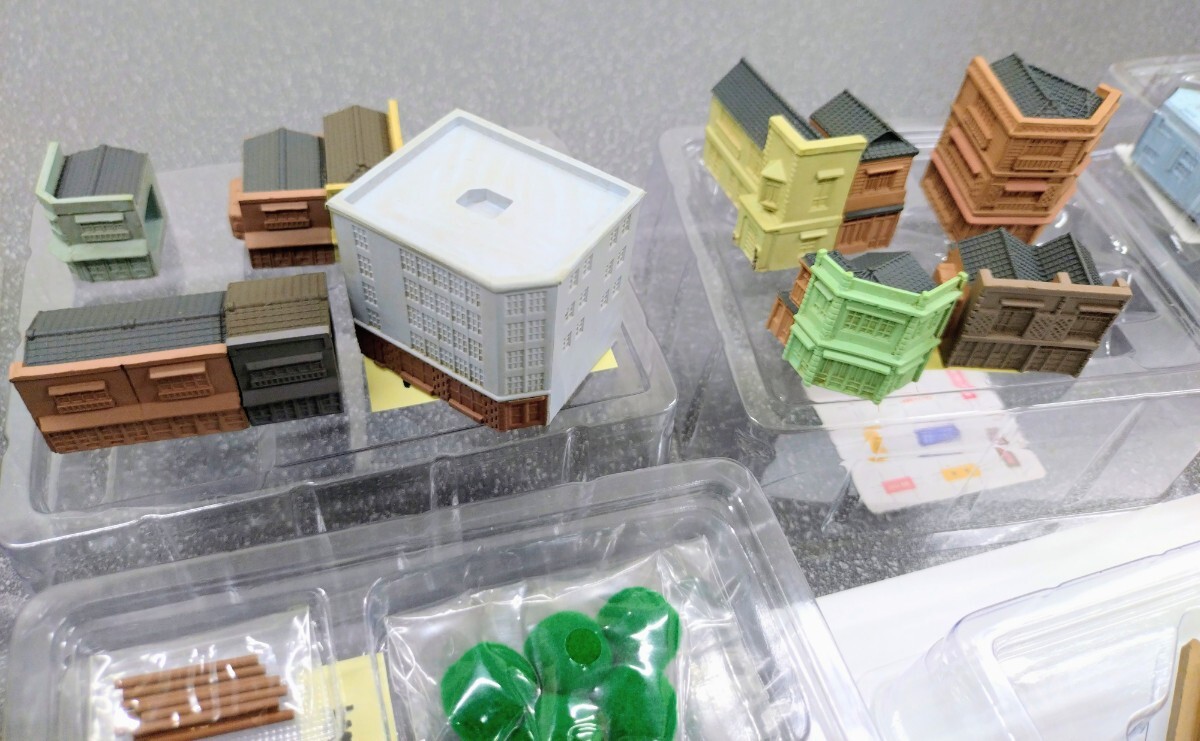 ■以前発売されたDeAGOSTINIの『週刊 昭和にっぽん鉄道ジオラマ』に含まれていた建物、ストラクチャー類です。■板状のパーツを組み立てるキットではなく、すでに彩色されたレジン(?)のブロック状のものを組み合わせていくもので、色合いやウエザリングはトミーテックの『街コレ』に近い感じす。窓は抜けていませんので、ユーザーで墨入れや色足しをしてやるとグンと見栄えがしてきます。建物単体で鑑賞するというより、レイアウトに多数並べてリアリティのある街並みを再現することを目指しているもののようです。■できあがり見本として当方で所有する同じものを写真6~10にあげておきます。すべての窓に墨入れしているほか、一部には色足し、塗り替えをしているものもありますが、特に改造のようなことはしておりません。