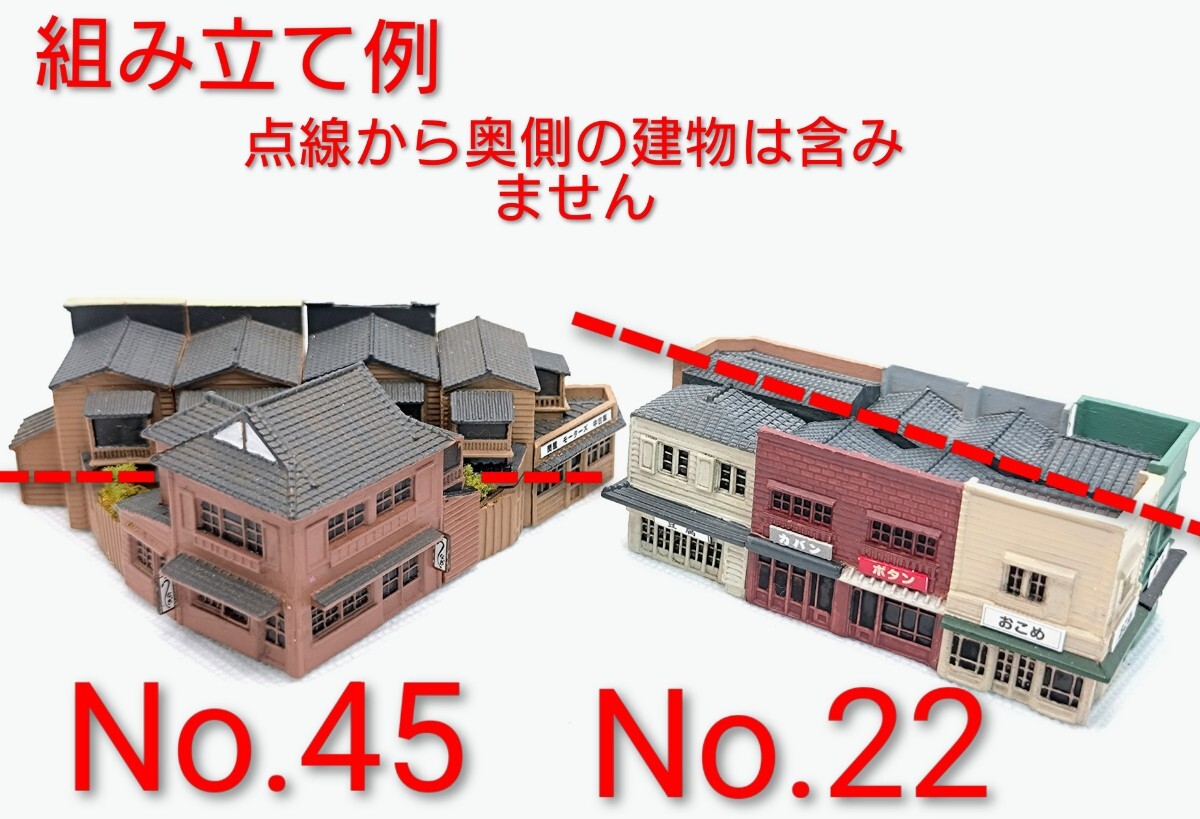 No.22と45はそれぞれの建物群を構成する反対側の建物が含まれていませんので、写真1、2と組み立て例の写真をご覧ください。