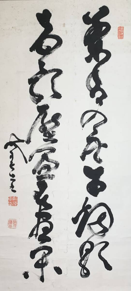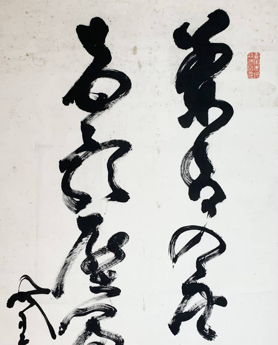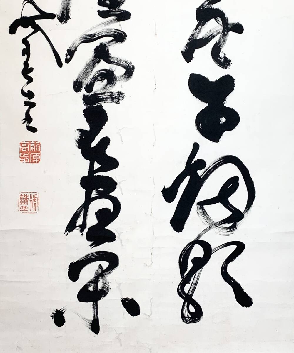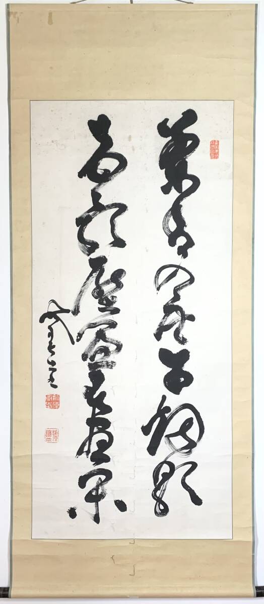 こちらの作品の状態ですが、  本紙中上部から表具下部にかけて、縦長に細い虫喰い跡が二列に断続的にあり、裏側からの簡易補修によって目立ちにくくはしてございますが、近づいて見るとよく分かる状態です。その他、本紙上部には薄汚れがございます。ただ、ヤケはほとんど無く強い折れ跡などもございません。鉄舟49歳に揮毫された作品です。