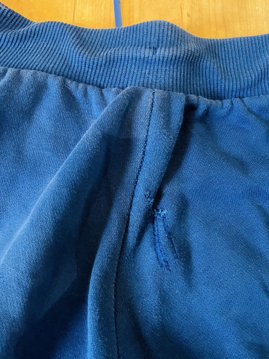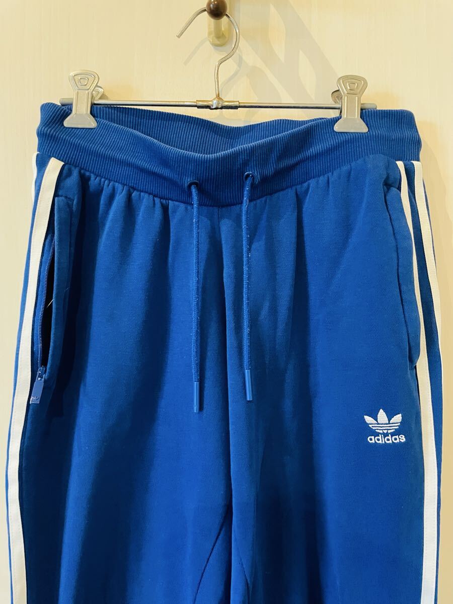 adidasの青いジョガーパンツ、3本ラインデザインでスタイリッシュ。格安訳あり品♪