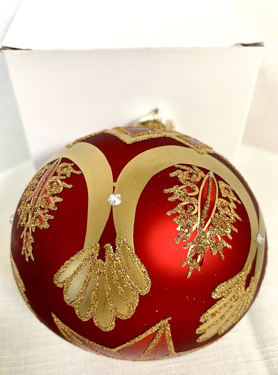 鮮やかな赤ベースに、金色のラメ描画およびガラスビーズ風アクセントが施され、光を受けて繊細に煌めく上品な印象があります。