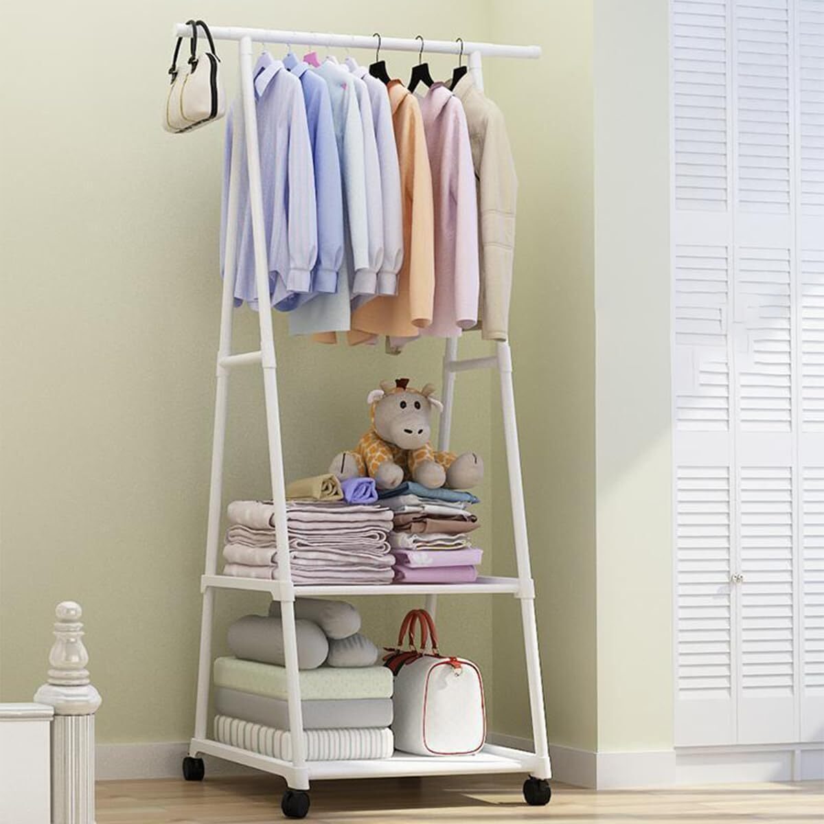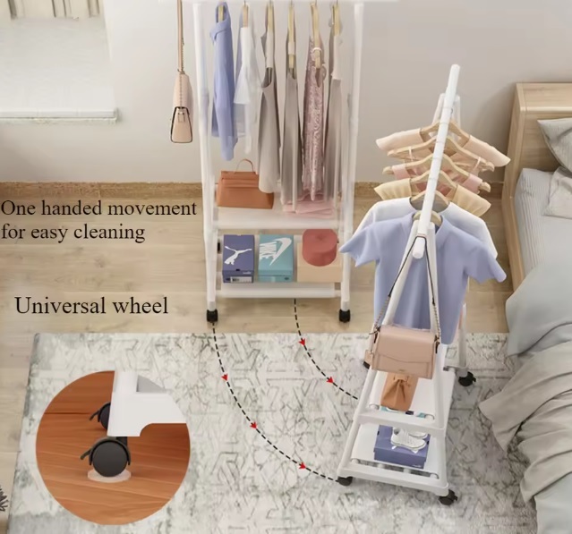シンプルハンガーラック 2段■マルチに使える!■シンプルだけど1.25kgと軽量で使いやすくて整理もしやすい。■スチールのフレームと不織布の棚だから軽く、そしてキャスターも付いているので移動もラクラク。衣類以外にサイドに小物やバックなども収納ができます。■ハンガー部の内寸は丈の長い上着なども掛けられる高めの(約)98cm設計です。■棚部分には小物や収納ボックスなども置けて、リビングや子供部屋、洗面上や玄関などでもご使用頂けます。■組立はネジを使わない差し込み方式で女性の方でも簡単に組立ができます。■また不要になったときの処分も費用がかからず簡単です。