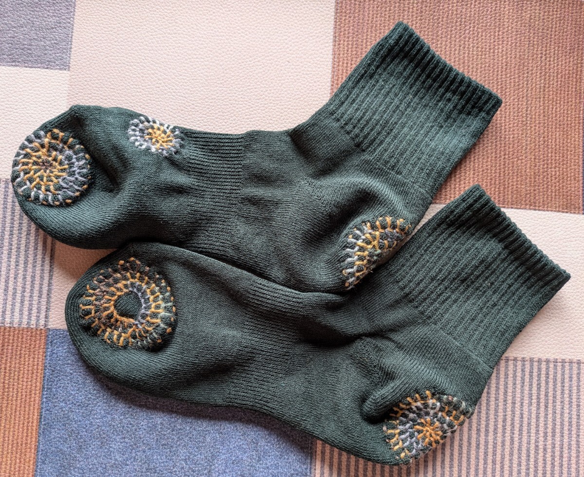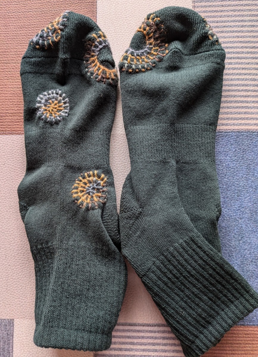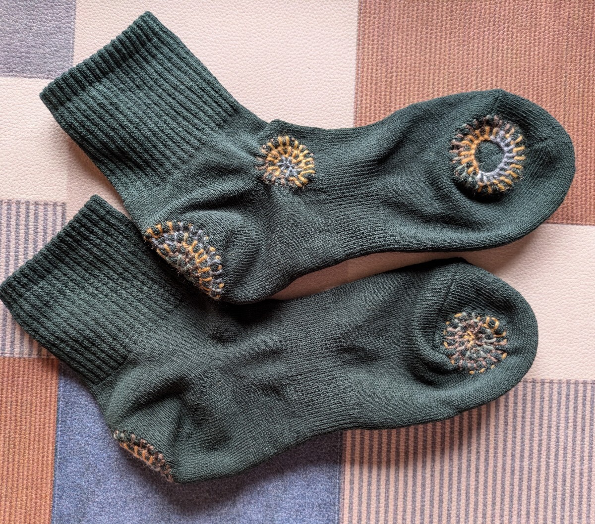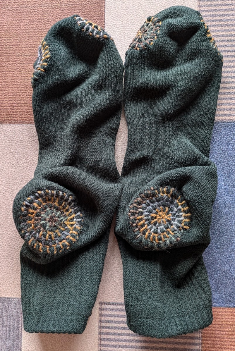 無印良品のパイル地ソックス(新品・ダークグリーン)に履いていると自然に傷む爪先やカカトにあらかじめダーニングを施しました。