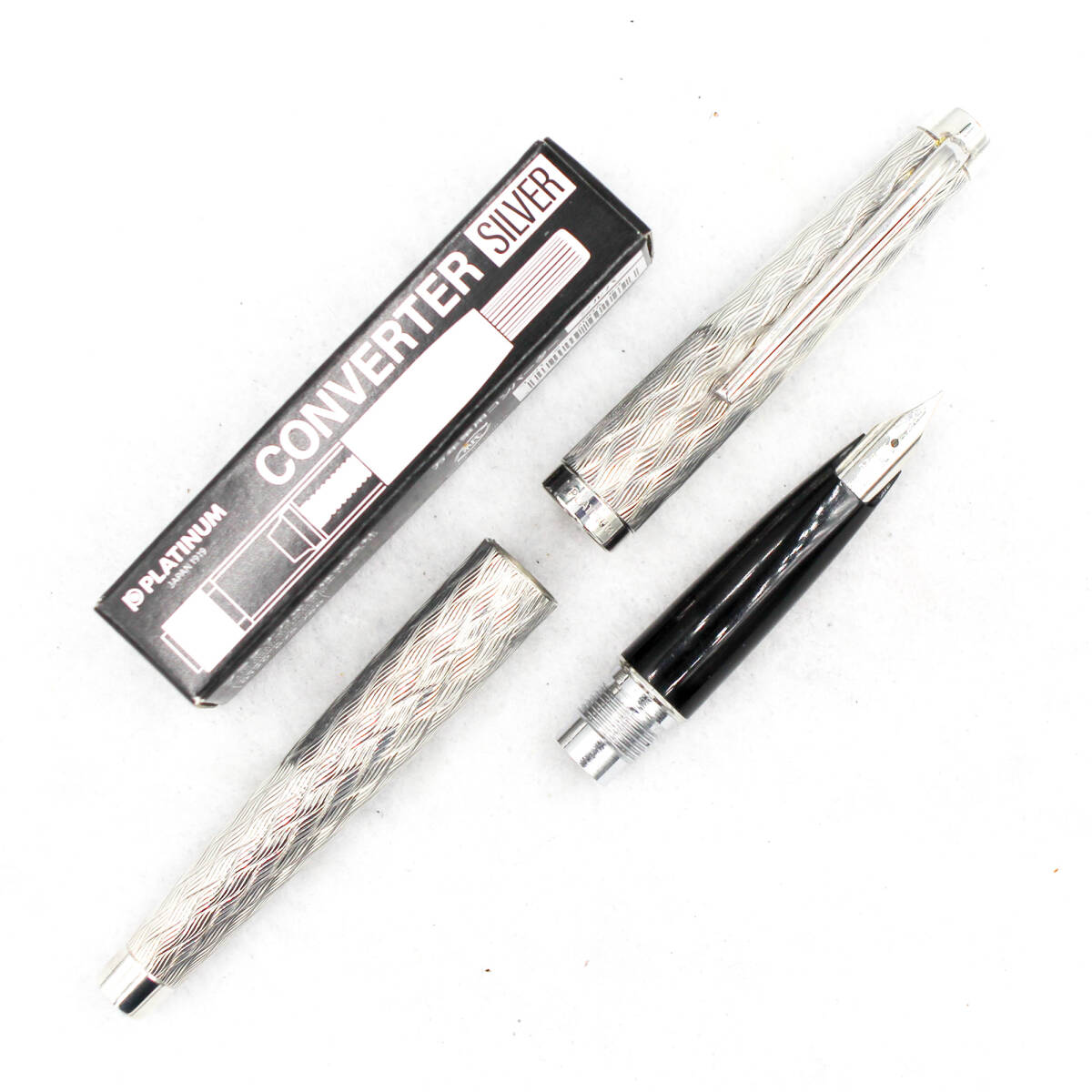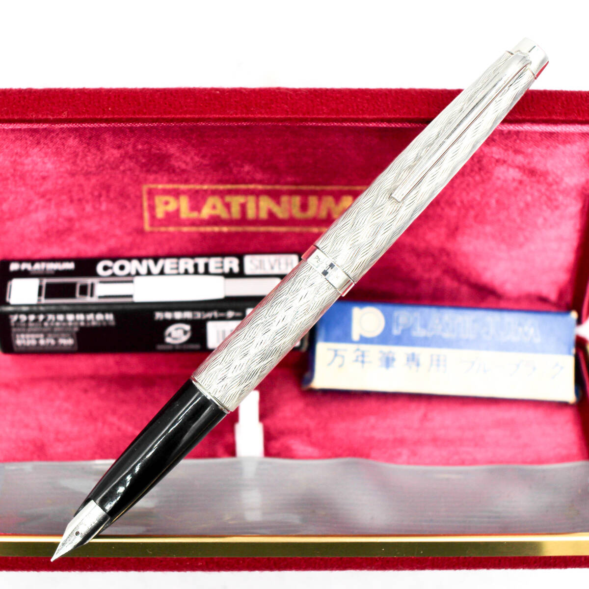 未使用 プラチナ・プラチナ スターリングシルバー(銀製)シェブロン波模様 万年筆 プラチナ(白金)製中字ニブ 純正コンバーター・元箱付