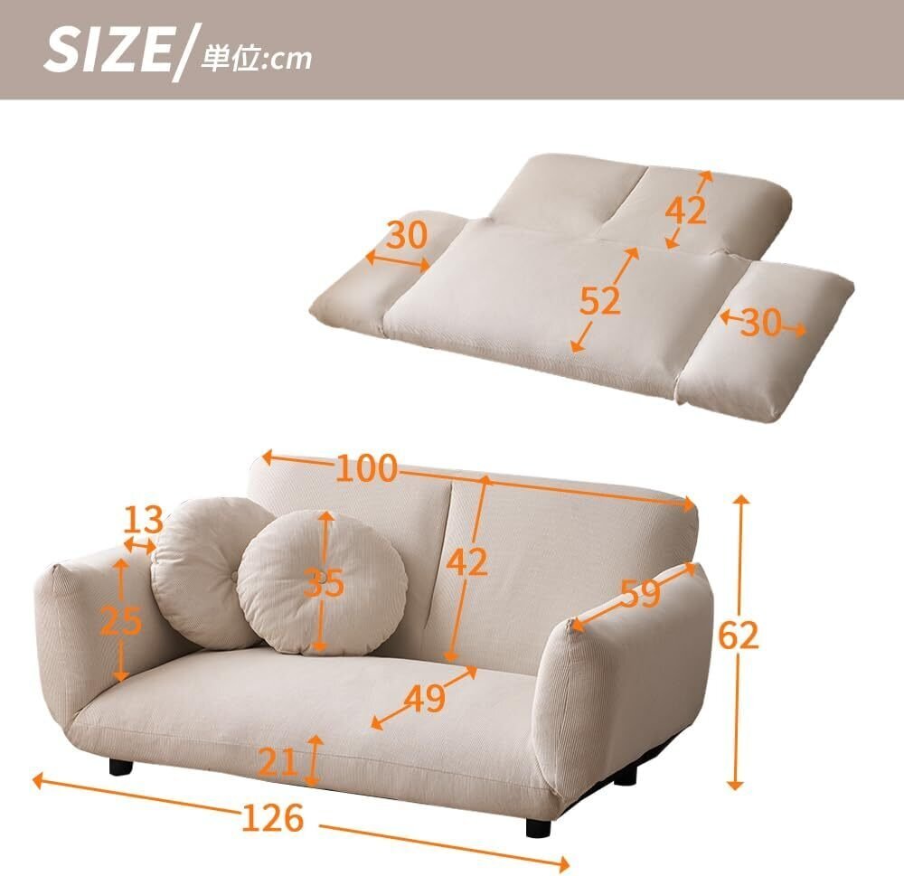 • ★【サイズ】約幅65×奥行き126~160×高さ21~62cm クッション:35×35cm(2個つき)◆材質:【構造部材】スチールパイプ【張り材】ポリエステル100%又はコーデュロイ【クッション材】ウレタンフォーム・ウレタンチップ・綿 ◆重量:約21kg(梱包材込み約23㎏)