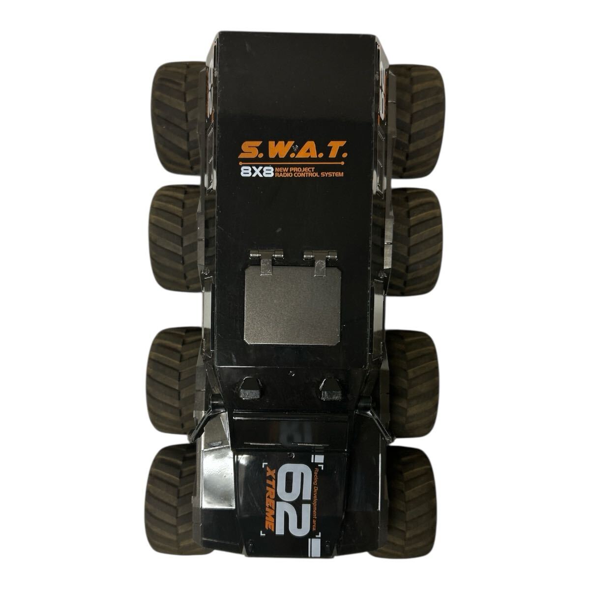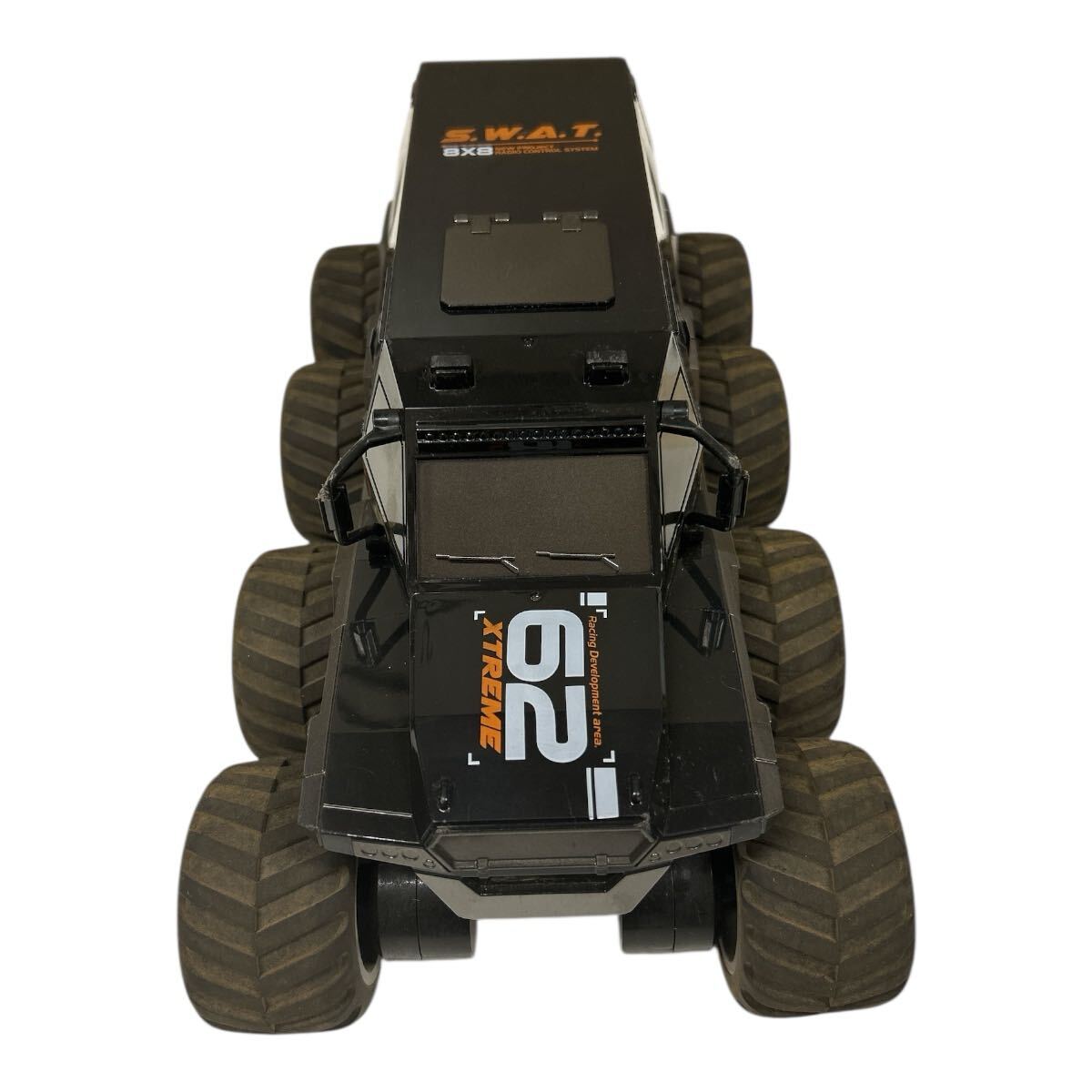 【8輪駆動 水陸両用ラジコン】:この大型ラジコンカーは、全長30cmのボディに8つのタイヤを搭載し、強力なパワーを発揮します。通常のオフロードラジコンカーと同様に、前進・後退・左右旋回が可能なだけでなく、ラジコンボートのように水上でも走行できます。8つの大型ゴムタイヤが十分な浮力を提供し、車体が表でも裏でも水に浮かぶ設計になっています。