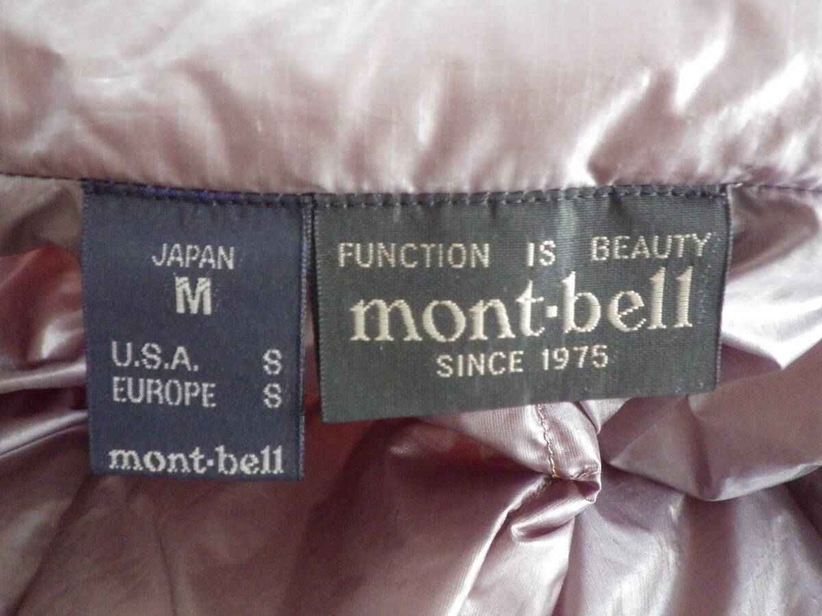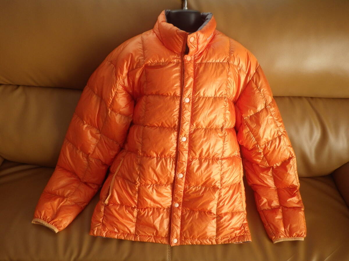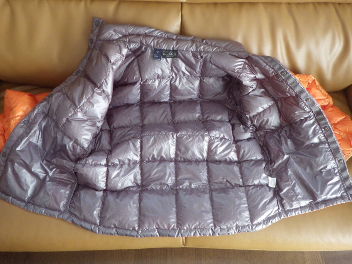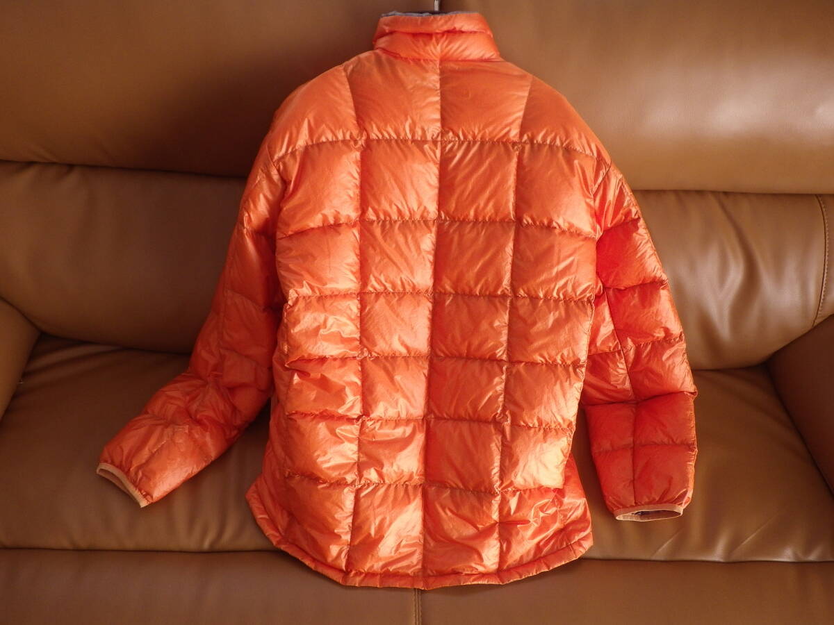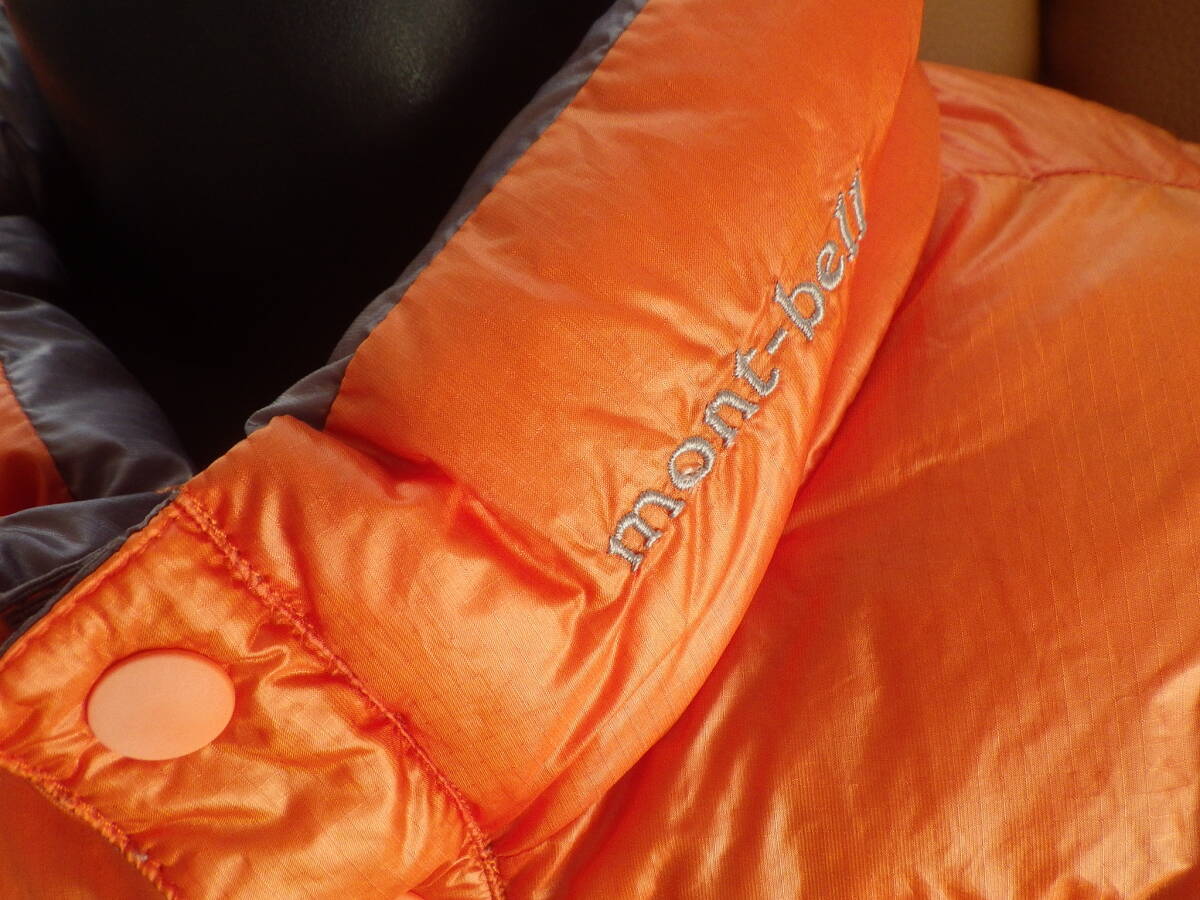 美品!モンベルの前ボタン式ダウンジャケット オレンジ色が目立ってアウトドアに最適