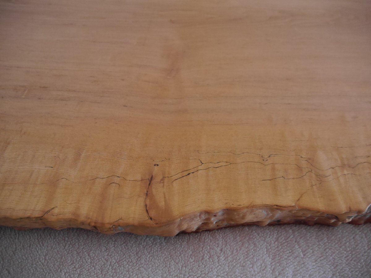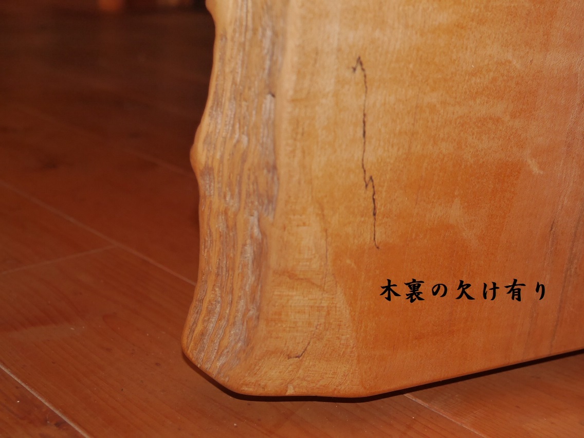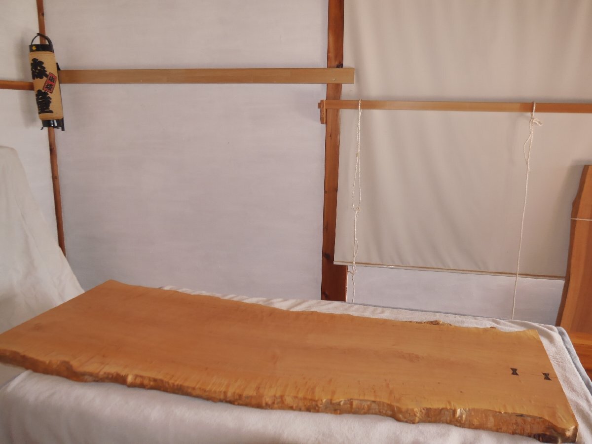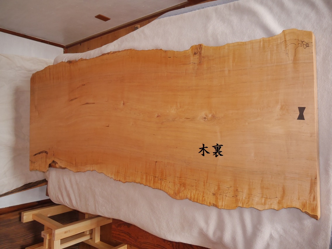 イタヤカエデ無垢一枚板 サイズ 長さ 200センチ・ 幅 74~67~58センチ・ 板厚 55ミリ 高さ約70センチ天然オイル仕上げ、ヒノキ製脚付 (耐震マット・脚フェルト・お手入れ用オイル・サービス)富山県産の樹齢300年のイタヤカエデ玉杢の天然乾燥板を使用しています。幅が狭い分、長い方が良いので、割れた部分を切らずに、黒檀のチギリを入れて製作しました。イタヤカエデは、乾燥途中に狂う物が多いのですが、この木は、それが無かったので、木の質が良い物でした。イタヤカエデは、硬くて緻密なので、テーブルには良い木です。一枚板テーブルは、自然が作った物なので、実物をご確認する事をおすすめしています。大きな物なので、搬入経路をご確認ください。2階以上に、上げる作業は、別途請求とさせて頂きます。なお、作業場に併設した店舗でも販売していますので、品切れの際は何卒ご容赦ください。
