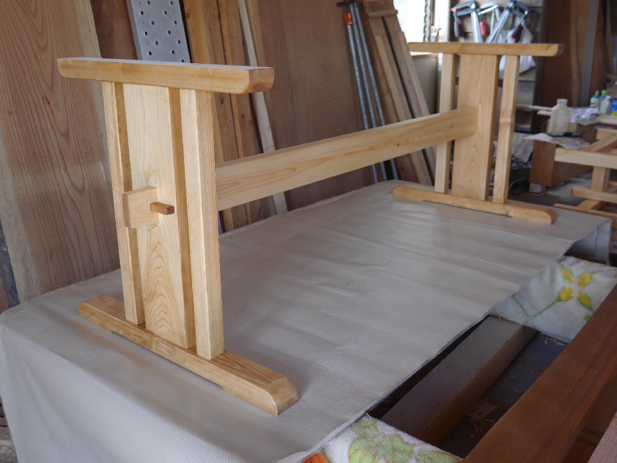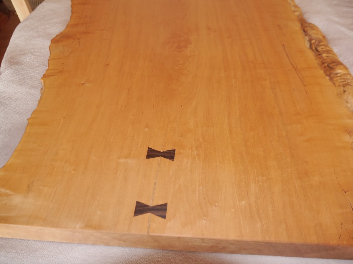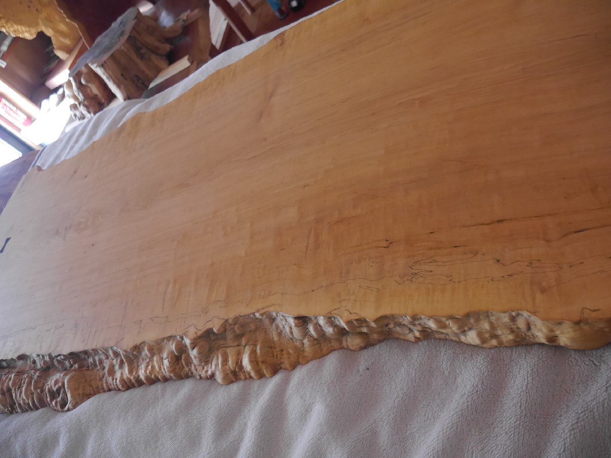 イタヤカエデ無垢一枚板 サイズ 長さ 200センチ・ 幅 74~67~58センチ・ 板厚 55ミリ 高さ約70センチ天然オイル仕上げ、ヒノキ製脚付 (耐震マット・脚フェルト・お手入れ用オイル・サービス)富山県産の樹齢300年のイタヤカエデ玉杢の天然乾燥板を使用しています。幅が狭い分、長い方が良いので、割れた部分を切らずに、黒檀のチギリを入れて製作しました。イタヤカエデは、乾燥途中に狂う物が多いのですが、この木は、それが無かったので、木の質が良い物でした。イタヤカエデは、硬くて緻密なので、テーブルには良い木です。一枚板テーブルは、自然が作った物なので、実物をご確認する事をおすすめしています。大きな物なので、搬入経路をご確認ください。2階以上に、上げる作業は、別途請求とさせて頂きます。なお、作業場に併設した店舗でも販売していますので、品切れの際は何卒ご容赦ください。