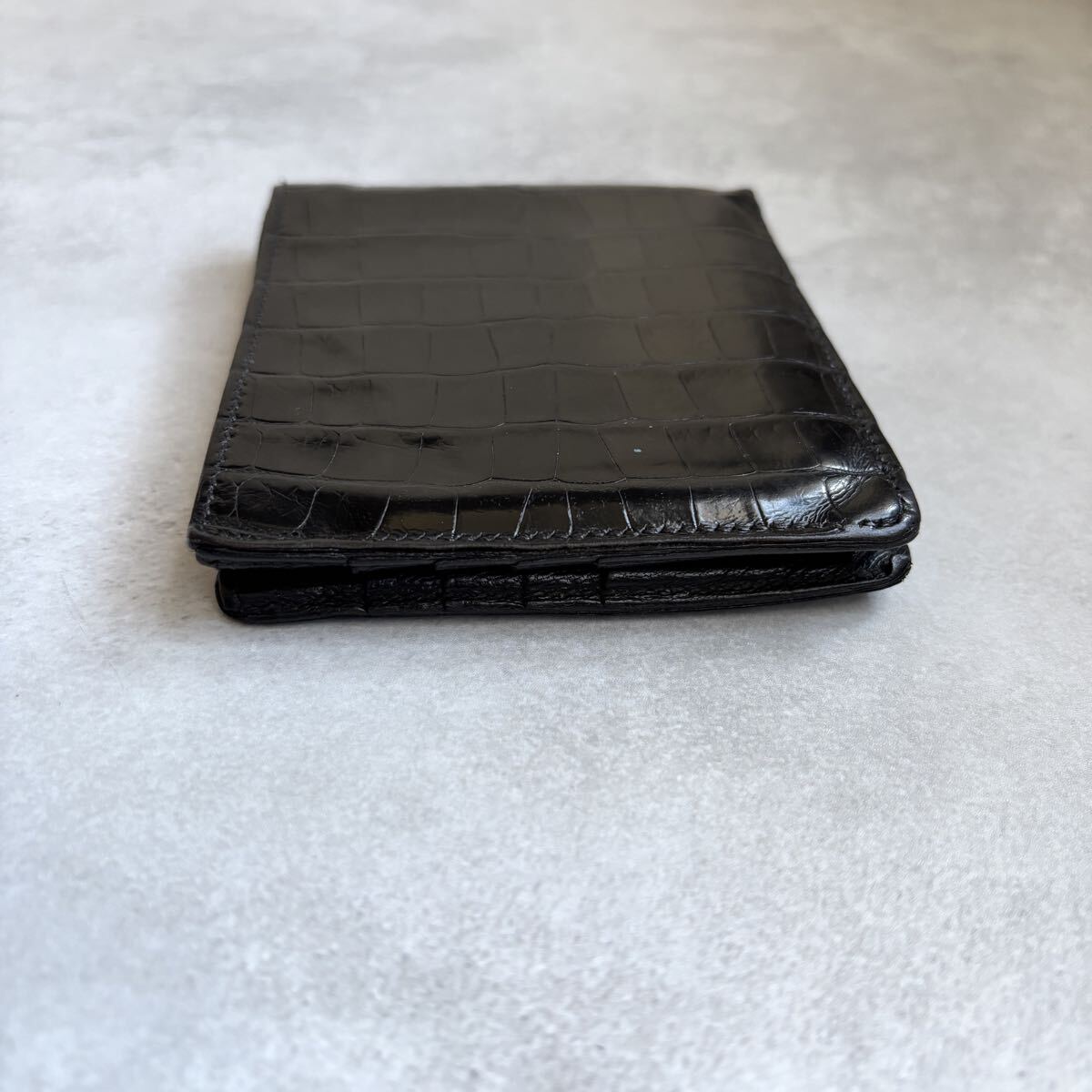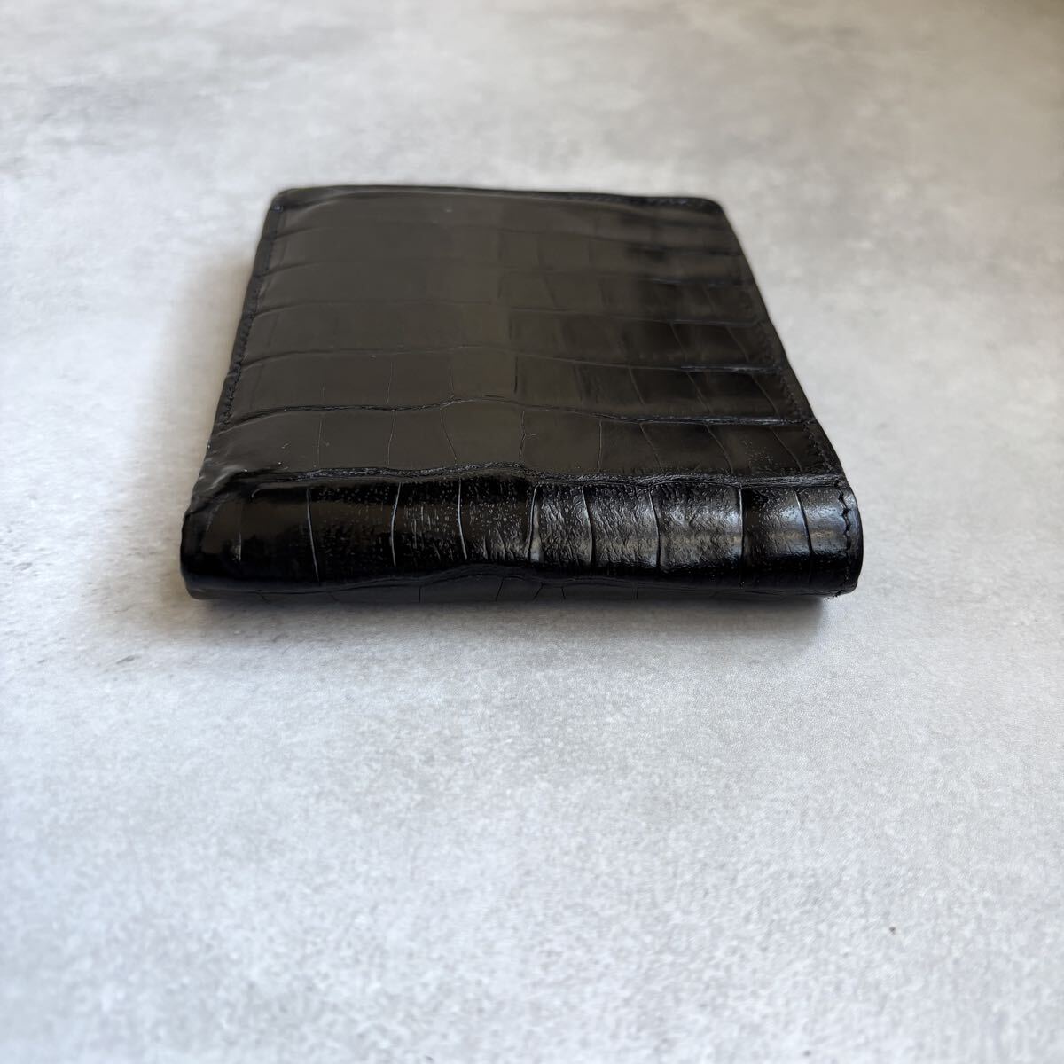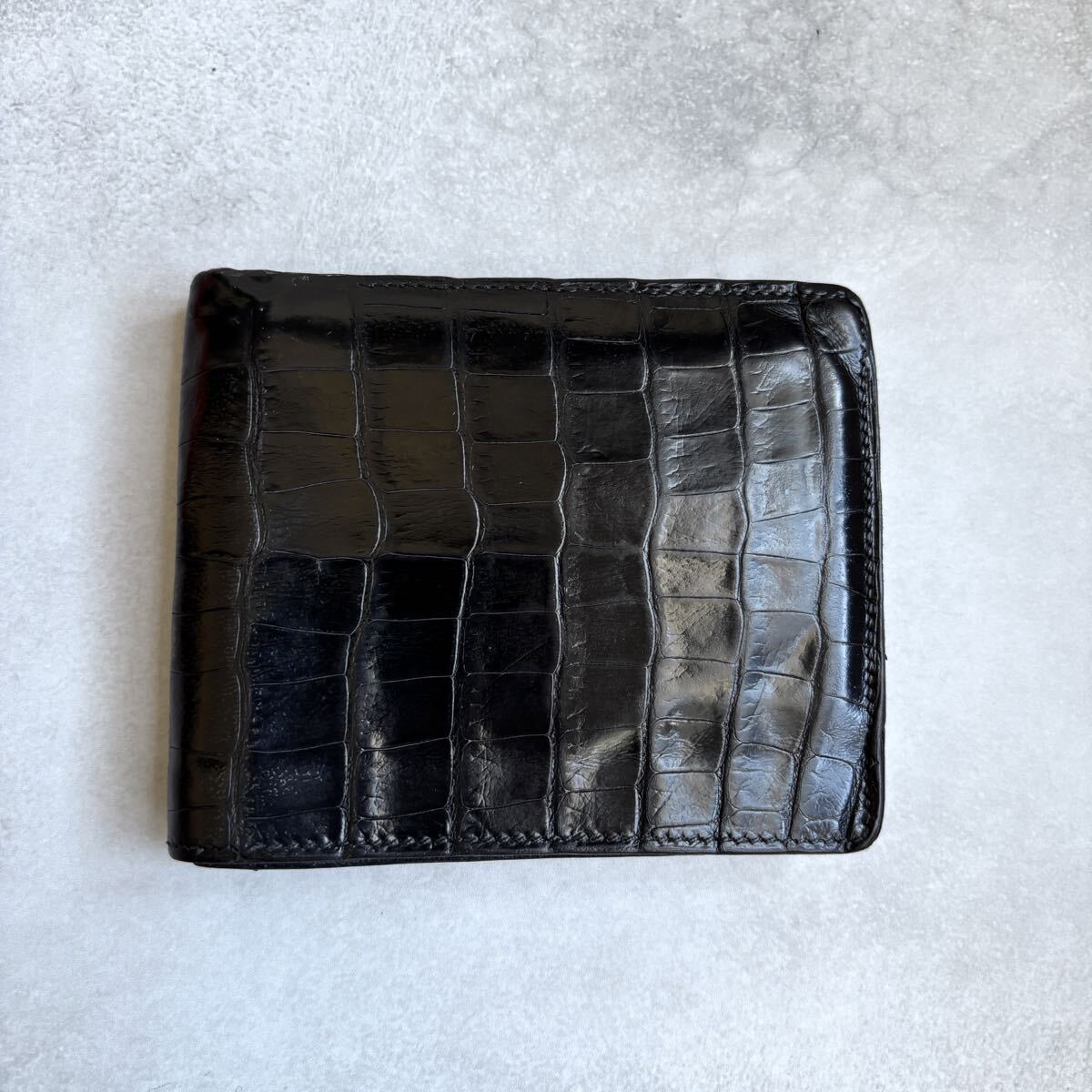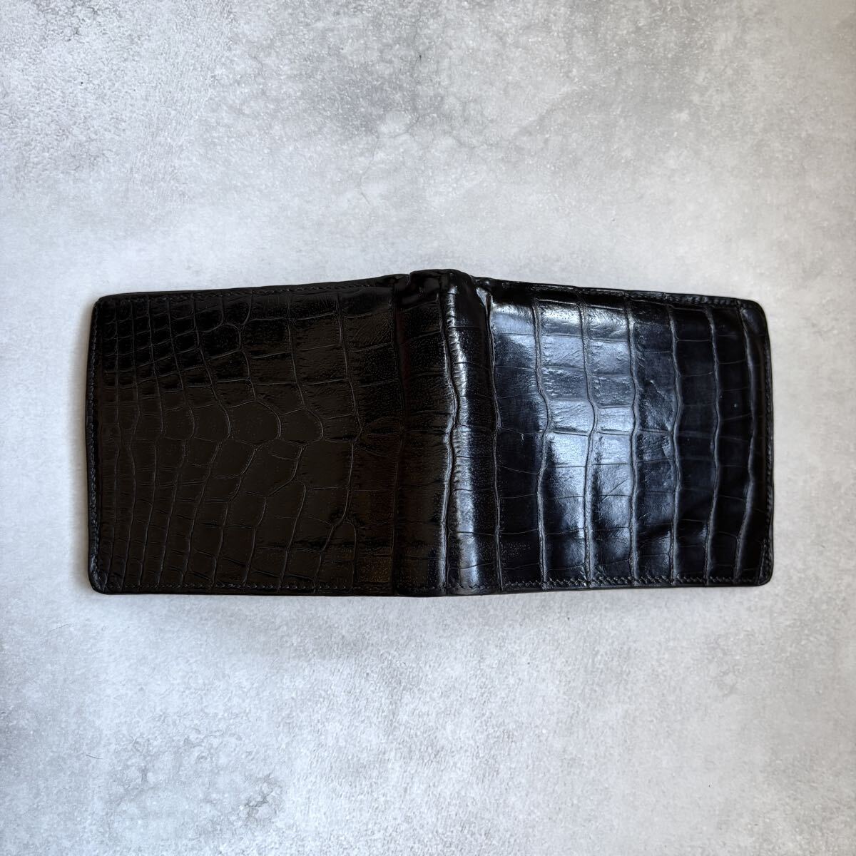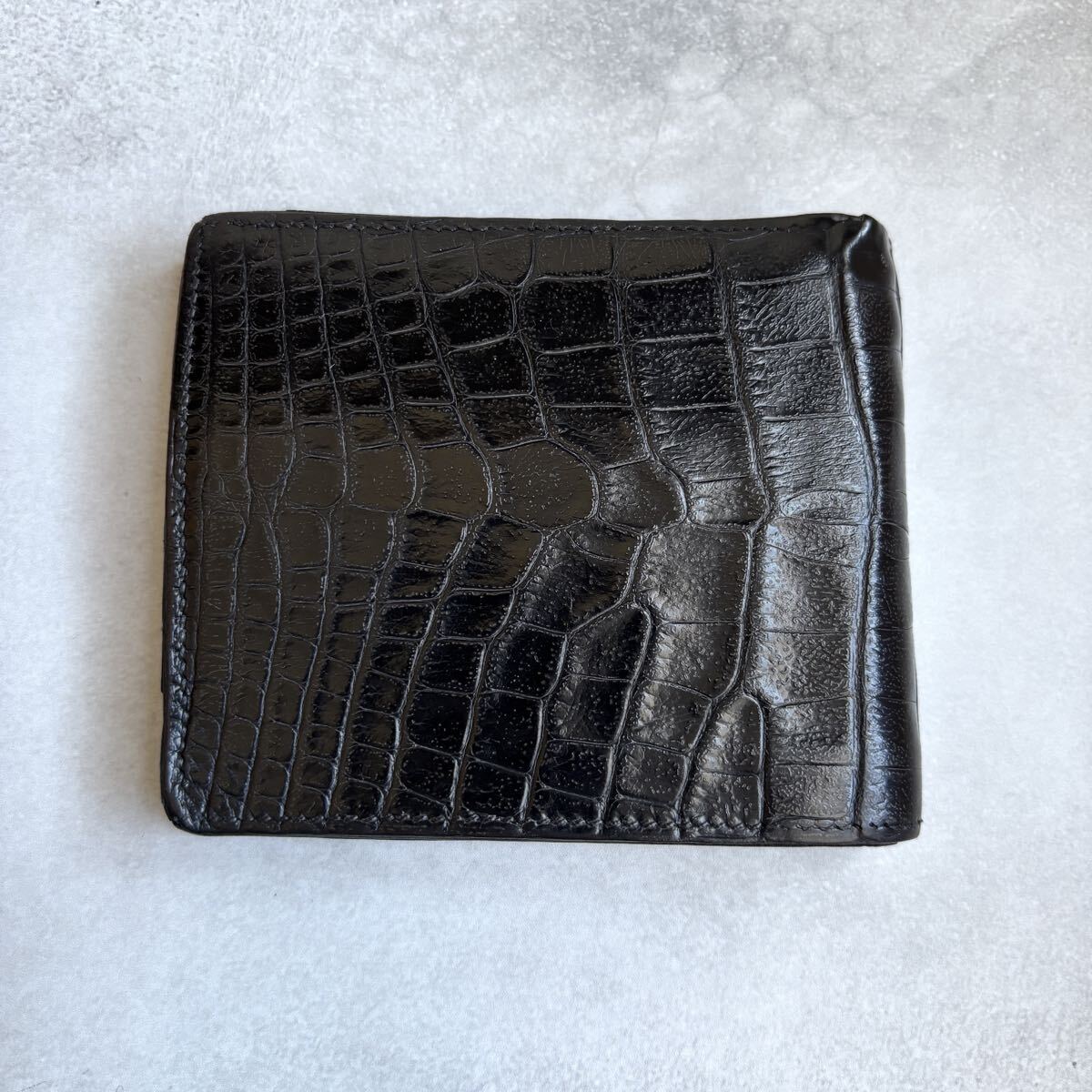 コバ角にリペア跡がありますが、写真の通りで手に取った時は気にならない程度です。新品の物に比べると少し片面のアリゲーターの黒が薄くなっている気がします。これも使えばしっくり馴染む良い風合いかと思います。加えて内側にややシワがあります。サイズ感もコンパクトに纏まっていてとても使いやすいと思います。