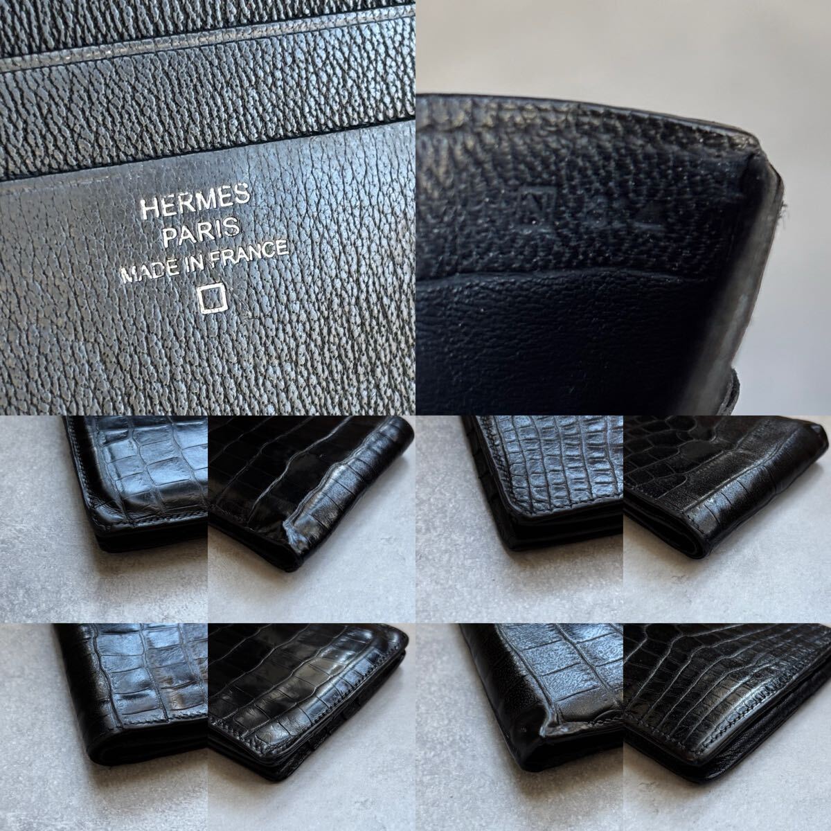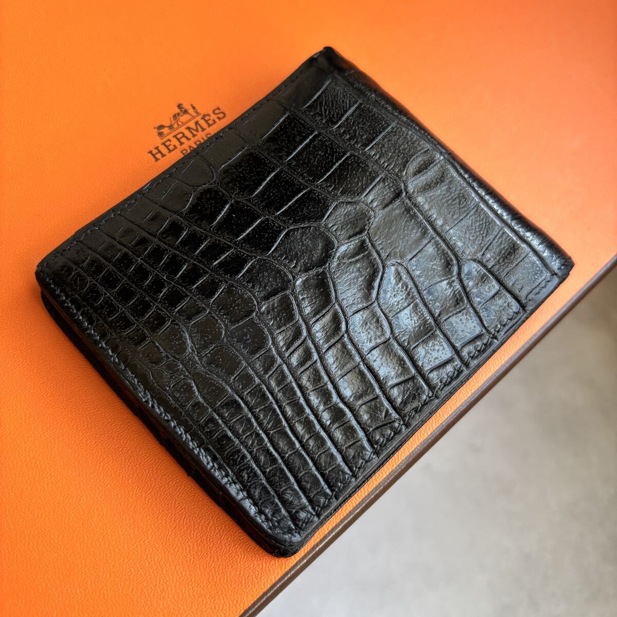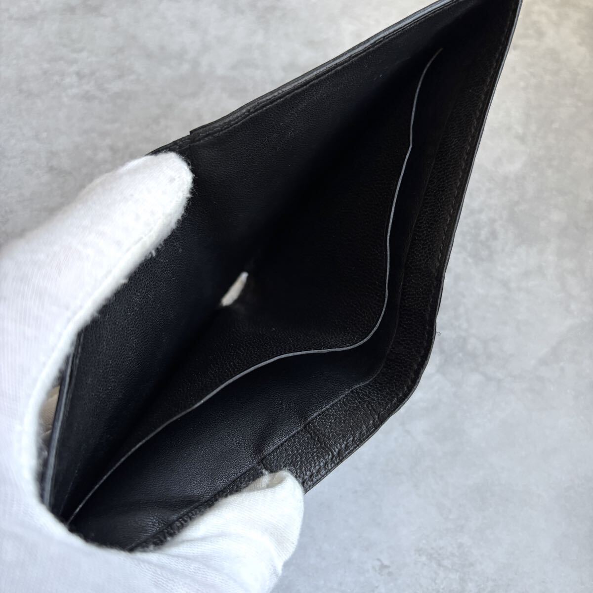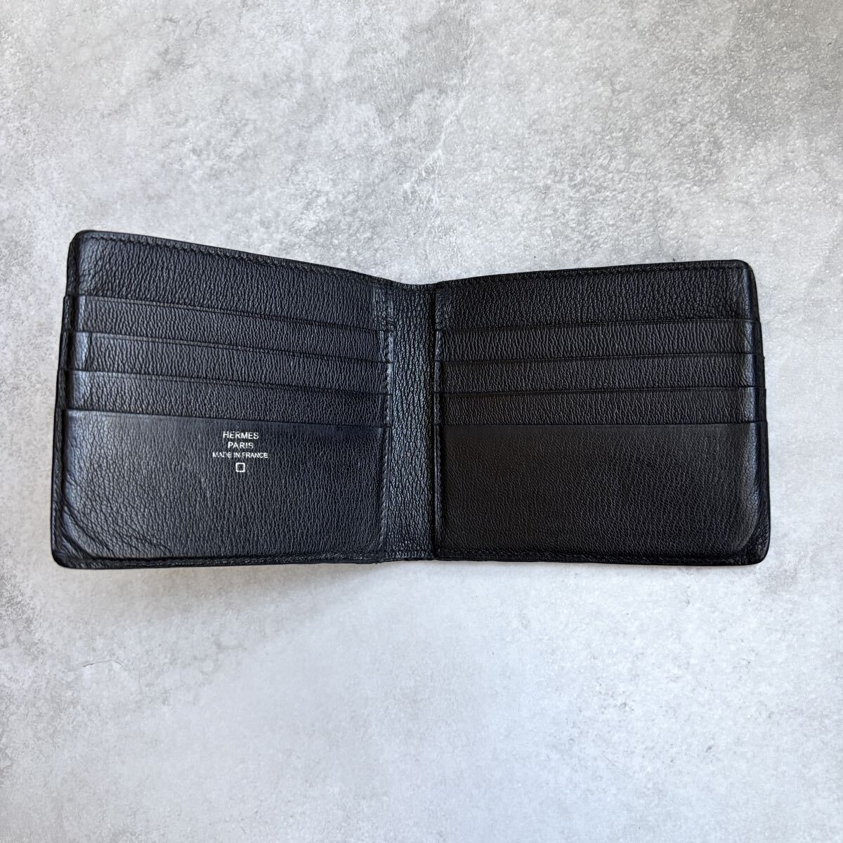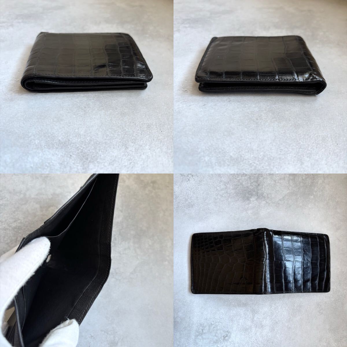 コバ角にリペア跡がありますが、写真の通りで手に取った時は気にならない程度です。新品の物に比べると少し片面のアリゲーターの黒が薄くなっている気がします。これも使えばしっくり馴染む良い風合いかと思います。加えて内側にややシワがあります。サイズ感もコンパクトに纏まっていてとても使いやすいと思います。