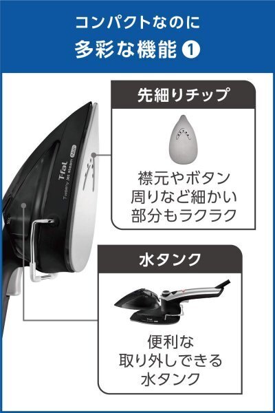 - 先端の細いチップで、襟元やボタン周りなどのデリケートな部分も簡単に処理可能。