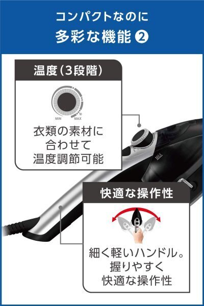 - 使いやすい細いハンドルと安定性のあるヘッドにより、スチーム時もアイロン時も快適に操作できます。