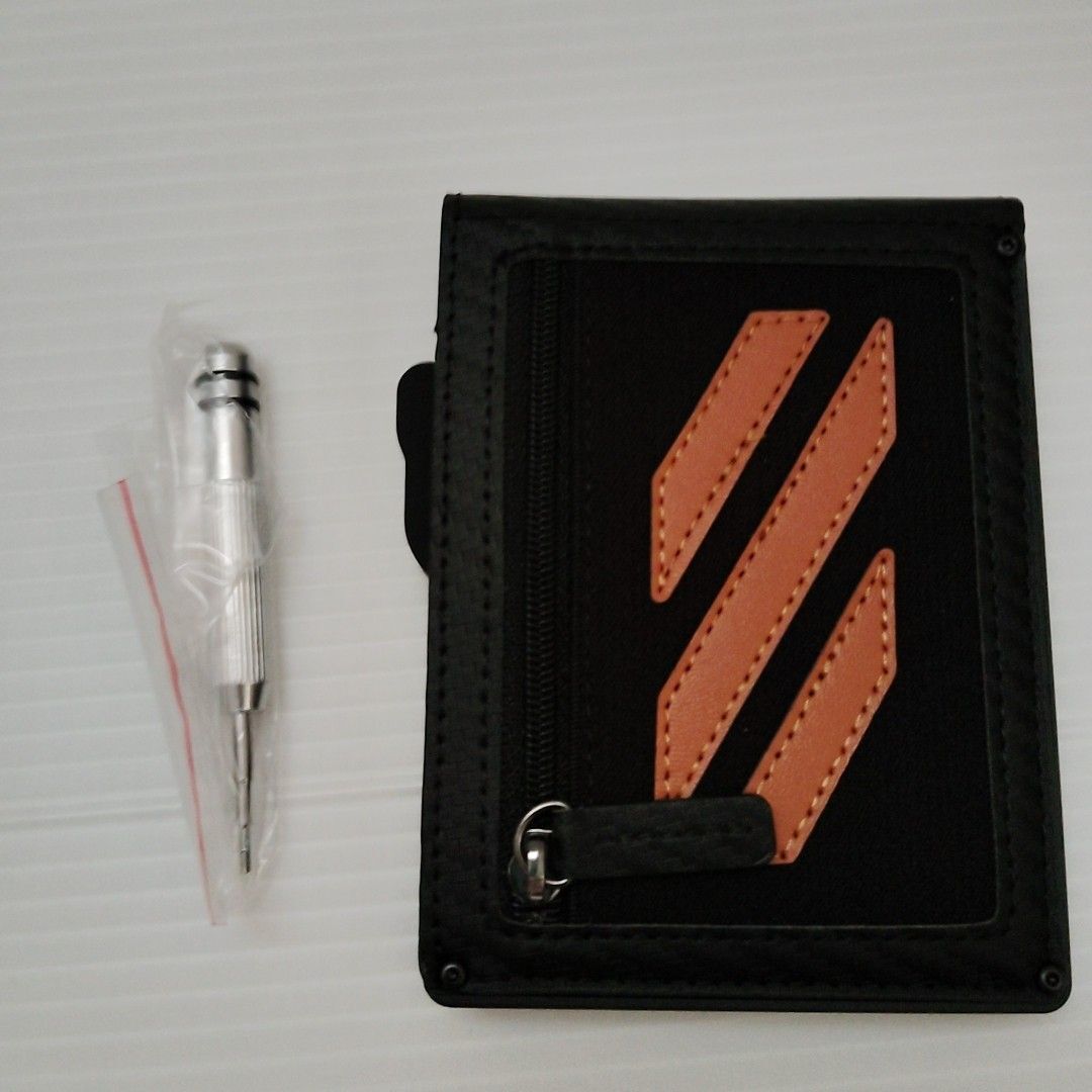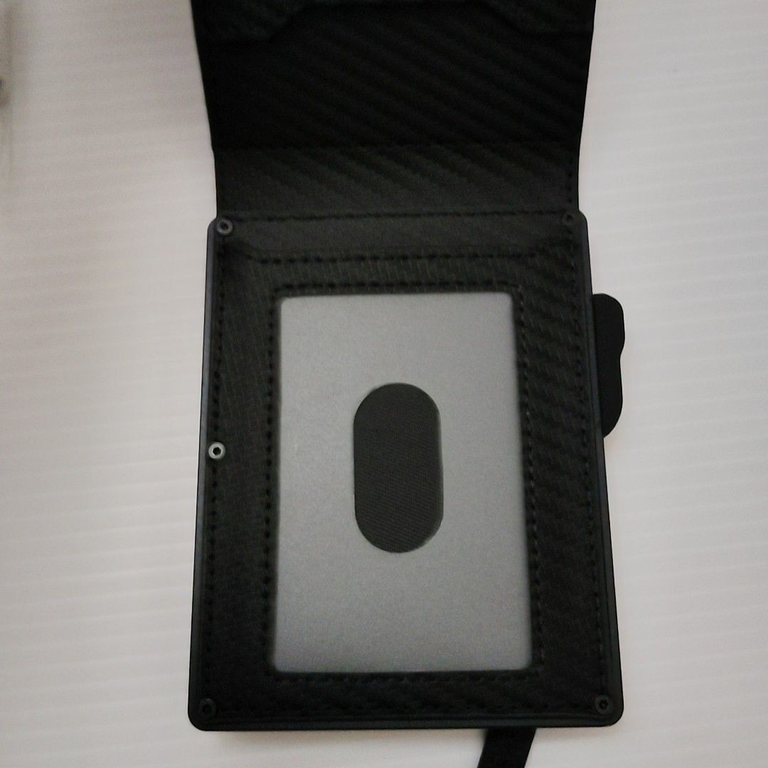 アルミニウム製カードホルダーは6枚のカードを収容でき、革カバーは追加の3 ~ 4枚のカードに空間を提供しています。