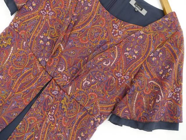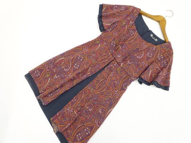 ひざ丈 半袖 Uネック ワンピース 36 ネイビー地 マルチカラー ペイズリー風柄