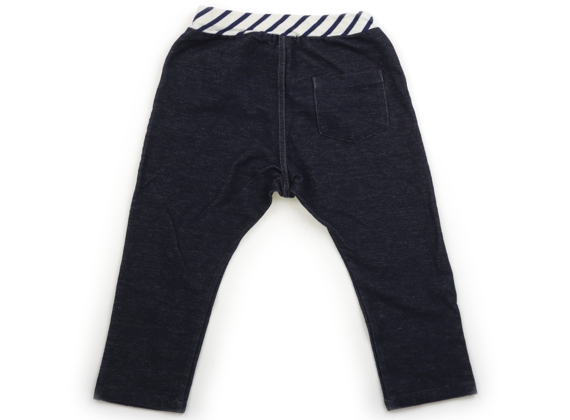 デニム風ストレッチパンツ、ウエストは総ゴムです。品質タグにシールはがし跡のノリ残りあり。薄っすら毛玉感ありますが、目立つ汚れはありません。