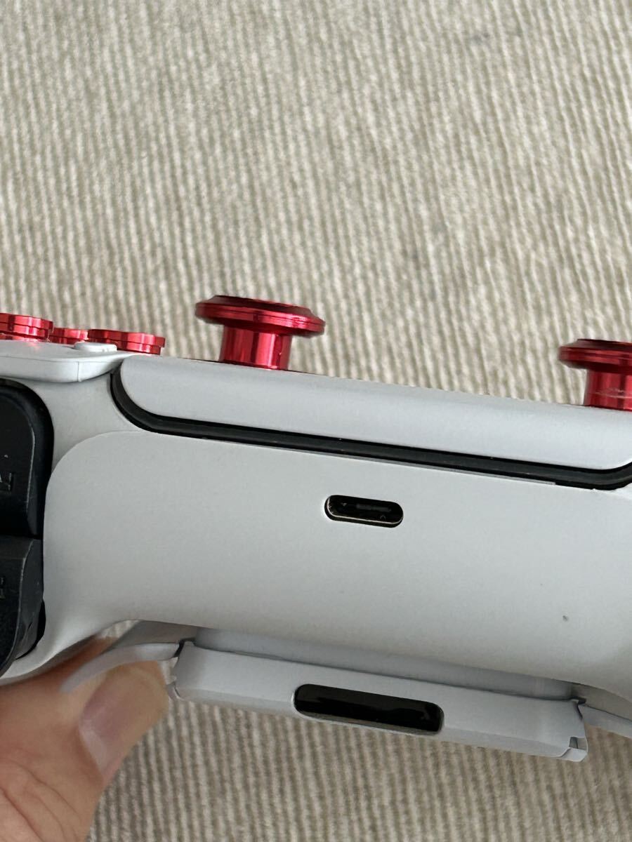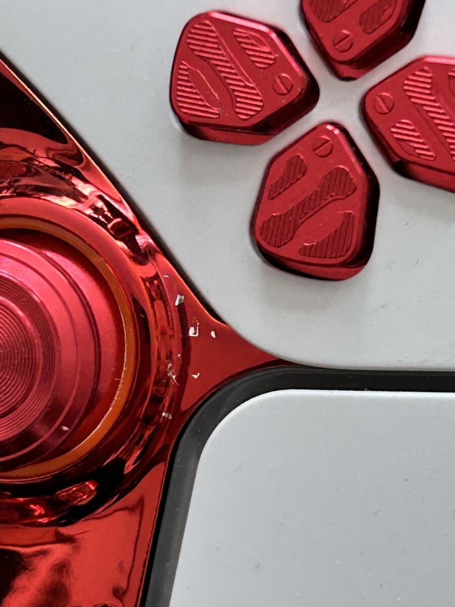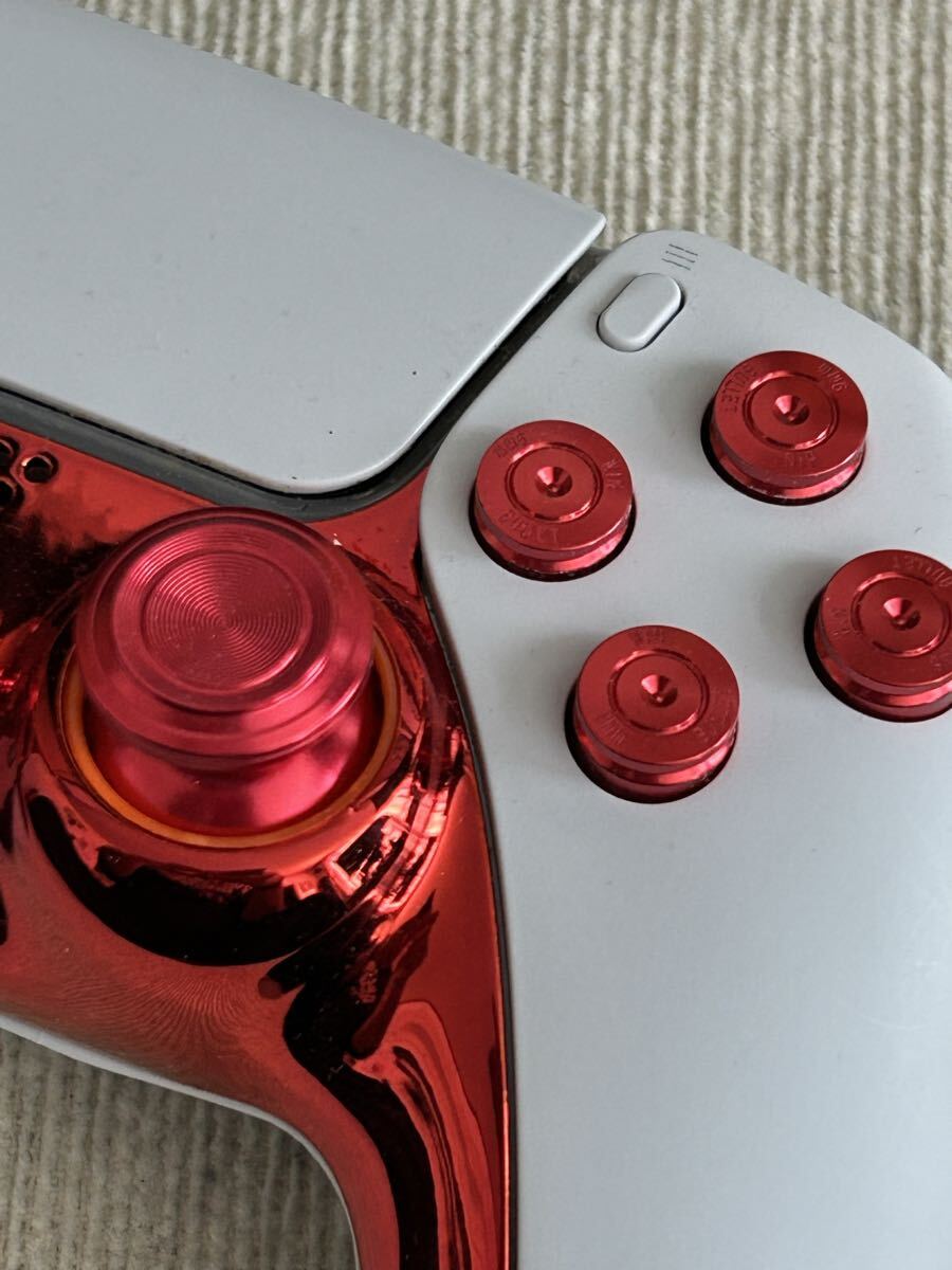 デュアルセンスのカスタムコントローラーです。エクストリームレイト製背面4ボタン、バンパー(L1R1)トリガー(L2R2)クリック化。TMRホールエフェクト型のスティックモジュールに交換済みでキャリブレーション済みです。スティックと十字キー、◯△ボタンはアルミ製の赤色に変えてあります。トリムパネルのスティック上側に一部メッキのハゲが小さくあります。USB端子の一部が欠けてますが問題なく充電、データ通信可能です。パーツ代だけで1万8千円掛かってますが、組み上げてから動作確認しただけで使ってないので、使っていただける方にお譲りします。悪い評価の無い方で連絡、決済、受け取り連絡が迅速な方のみとさせて頂きます。悪い評価が目立つ方は入札されても取り消しますのでご了承ください。よろしくお願いいたします。発送はレターパックプラスです。