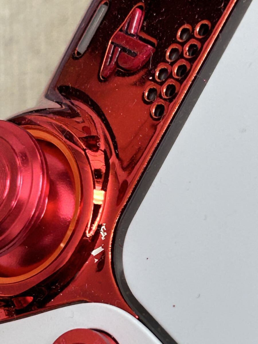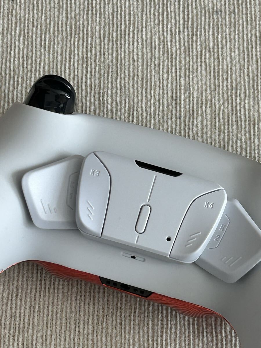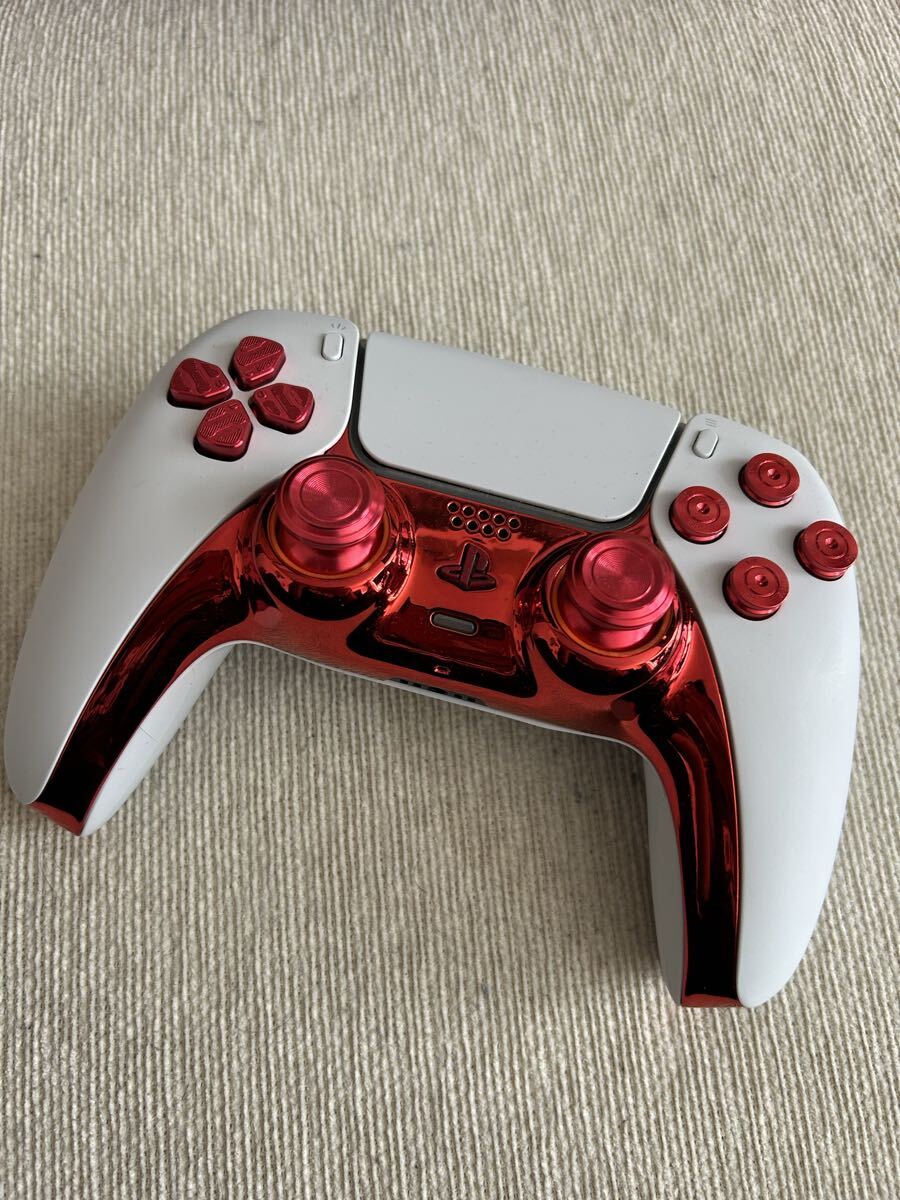 デュアルセンスのカスタムコントローラーです。エクストリームレイト製背面4ボタン、バンパー(L1R1)トリガー(L2R2)クリック化。TMRホールエフェクト型のスティックモジュールに交換済みでキャリブレーション済みです。スティックと十字キー、◯△ボタンはアルミ製の赤色に変えてあります。トリムパネルのスティック上側に一部メッキのハゲが小さくあります。USB端子の一部が欠けてますが問題なく充電、データ通信可能です。パーツ代だけで1万8千円掛かってますが、組み上げてから動作確認しただけで使ってないので、使っていただける方にお譲りします。悪い評価の無い方で連絡、決済、受け取り連絡が迅速な方のみとさせて頂きます。悪い評価が目立つ方は入札されても取り消しますのでご了承ください。よろしくお願いいたします。発送はレターパックプラスです。