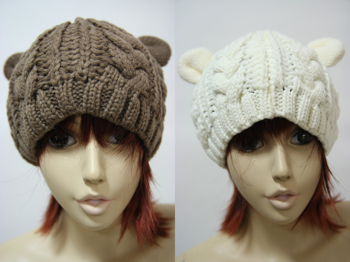 送料無料◆2色組◆プレーンカラー◆手編み風◆ふんわりあったか◆ネコ耳付き◆ニット帽(ブラウンベージュ&ホワイトクリーム)fas-440
