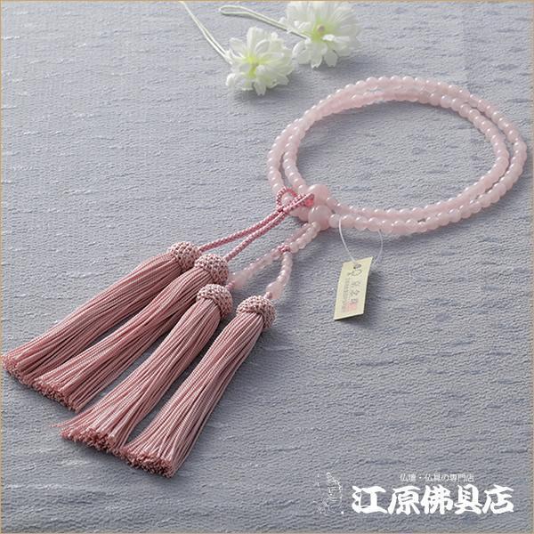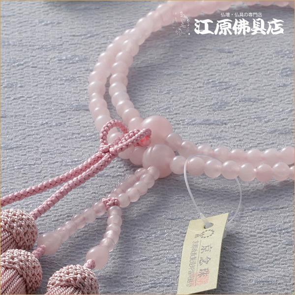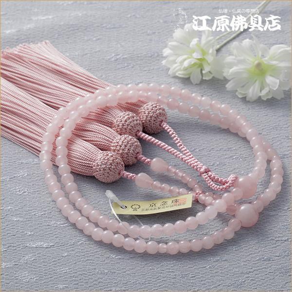 【京念珠/女性】浄土真宗:ローズクォーツ(紅石英)八寸共仕立 正絹頭付≪桐箱入り≫【余宗用/本式/念珠/数珠/女性】