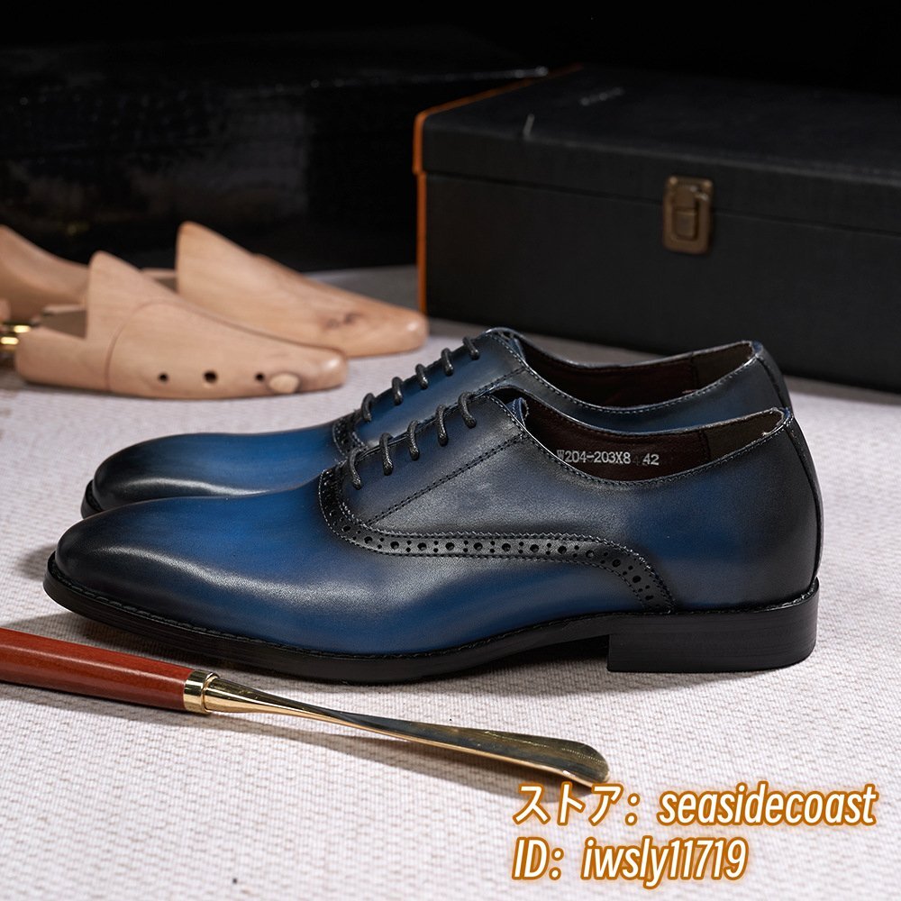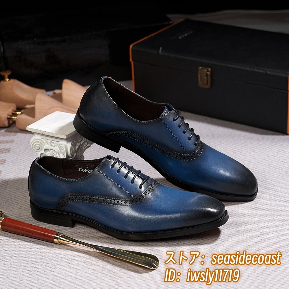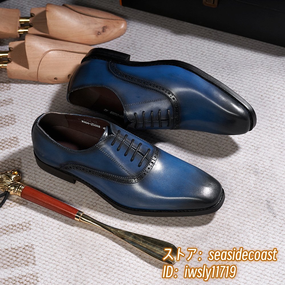 定価9万超■新品 メンズシューズ ビジネスシューズ 職人手作り 彫り 高級牛革 紳士靴 レザーシューズ 本革 革靴 冠婚葬祭 ブルー 25.5cm