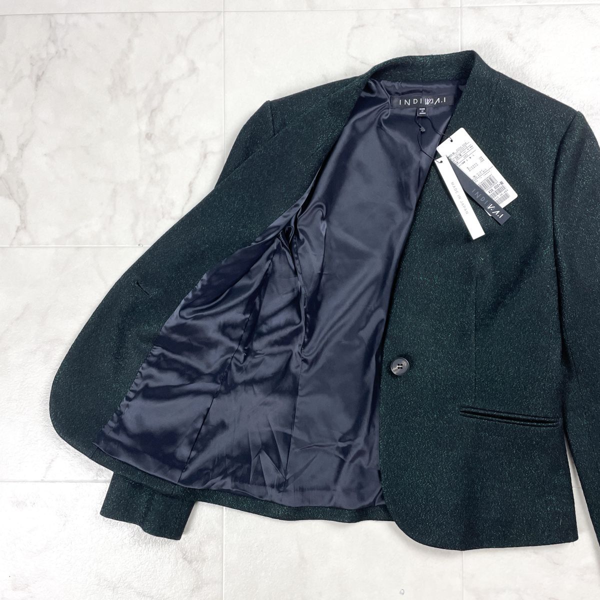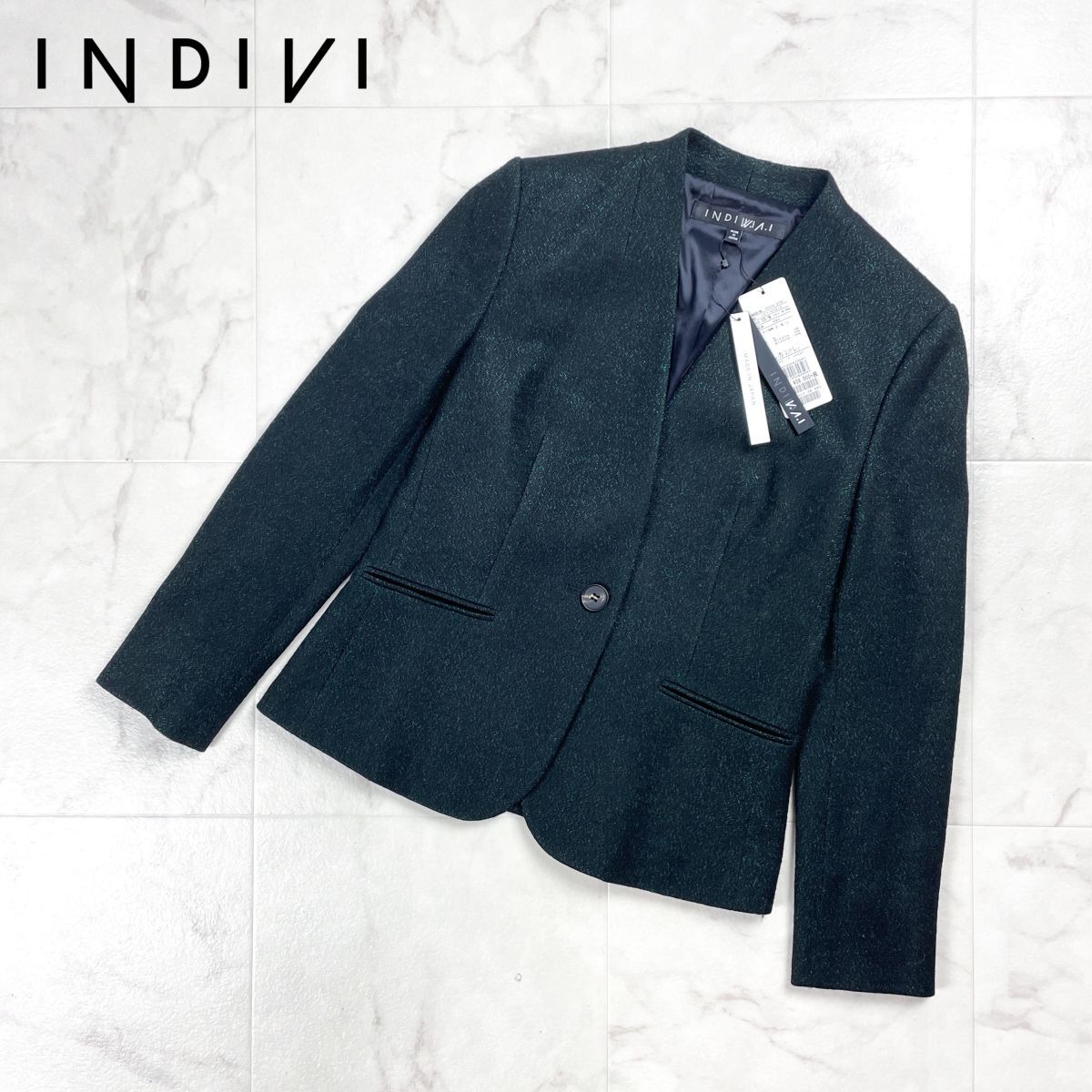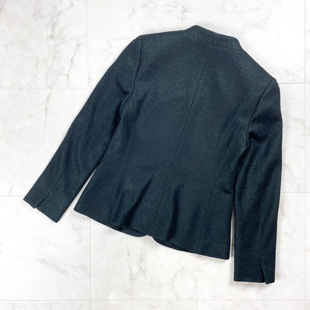 新品未使用タグ付 INDIVI インディヴィ ノーカラージャケット ラメ 偏光 長袖 日本製 レディース 緑 グリーン 黒 ブラック サイズM*GD264