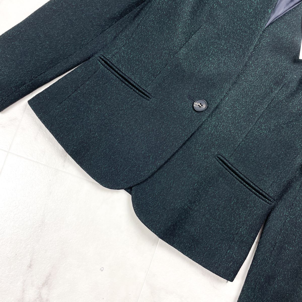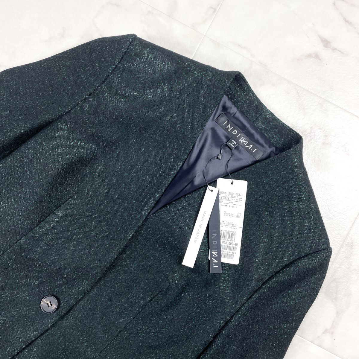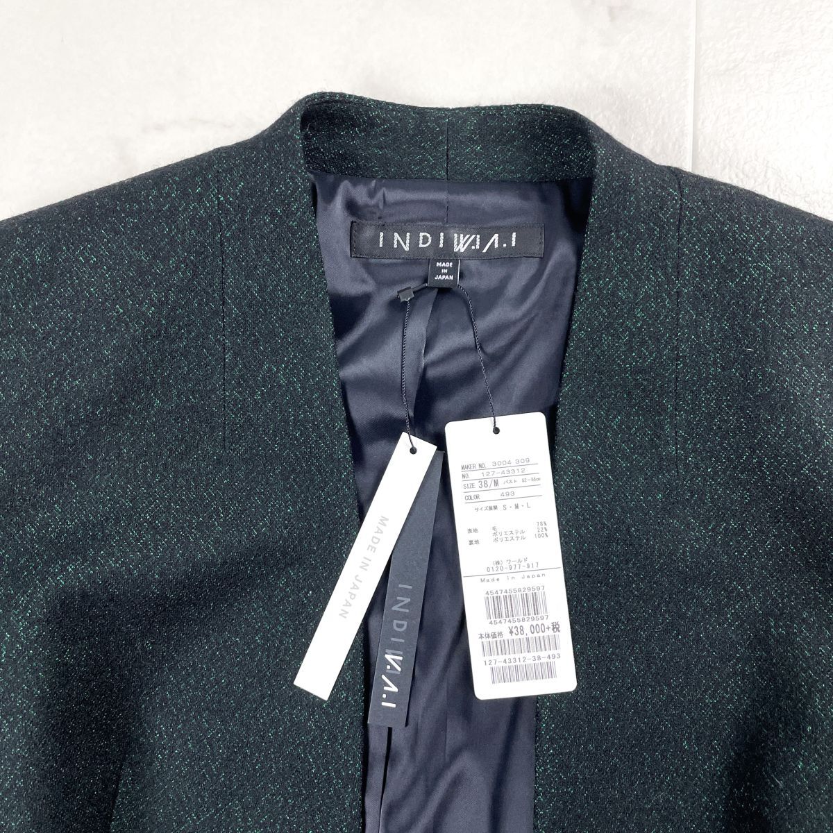 新品未使用タグ付 INDIVI インディヴィ ノーカラージャケット ラメ 偏光 長袖 日本製 レディース 緑 グリーン 黒 ブラック サイズM*GD264