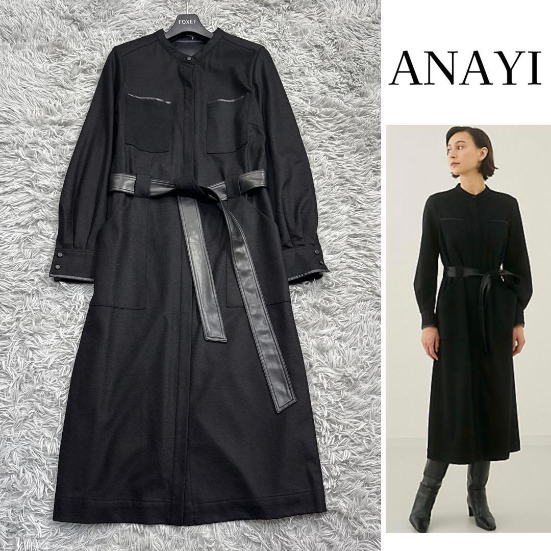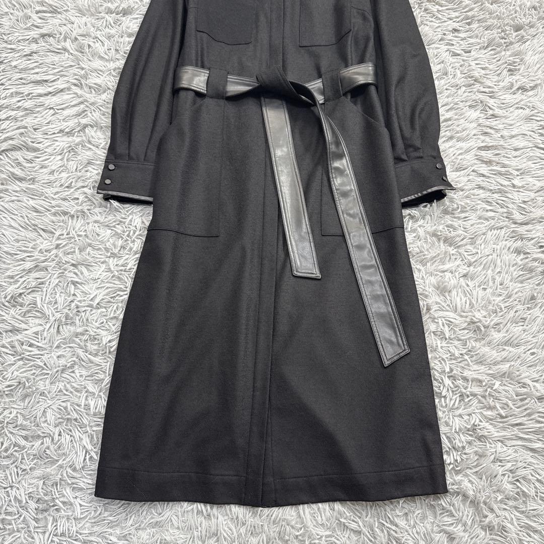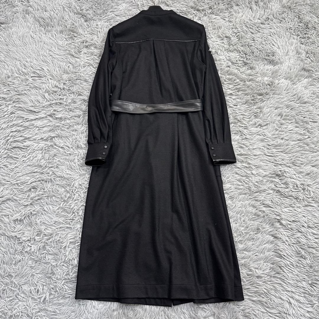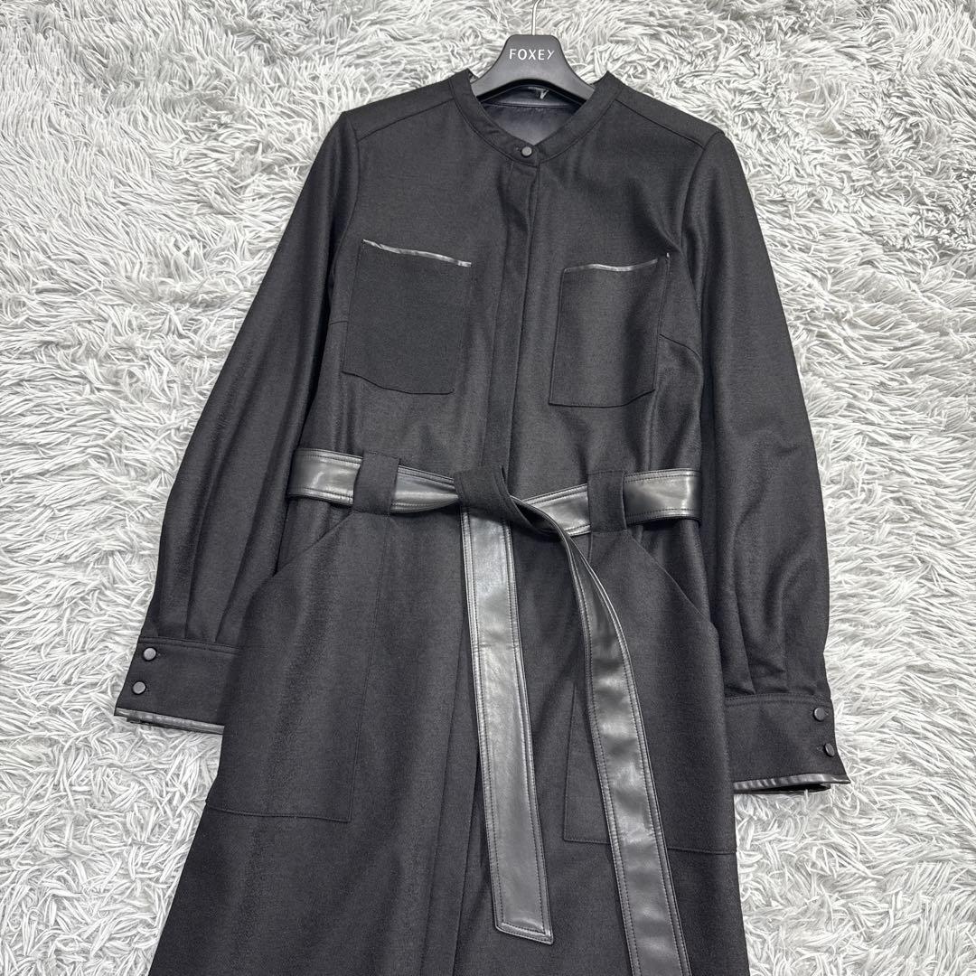 スタンドカラーと比翼仕立のシャープな印象のワンピースは、Iラインシルエット。衿内側、ポケット口、袖口、後ろシーム切り替え位置にフェイクレザー使いでポイントを付けました。