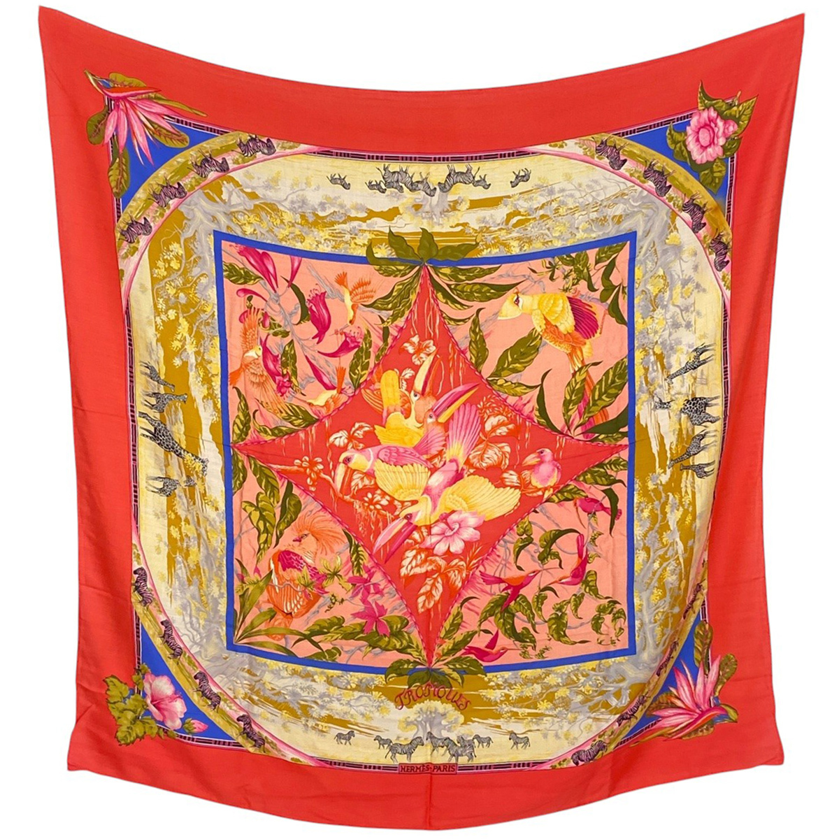 | エルメス HERMES カレ 140 TROPIQUES トロピカル 花柄 鳥柄 スカーフ 大判 ショール カシミヤ レッド マルチカラー レディース 【中古】 |