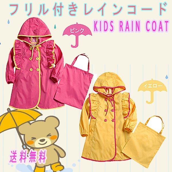 【アウトレット品】キッズ用 フリルレインコート ポーチ付 / 選べる色 サイズ 子供用 RAIN COAT 合羽 女の子 雪 豪雪 梅雨両手 送料無料