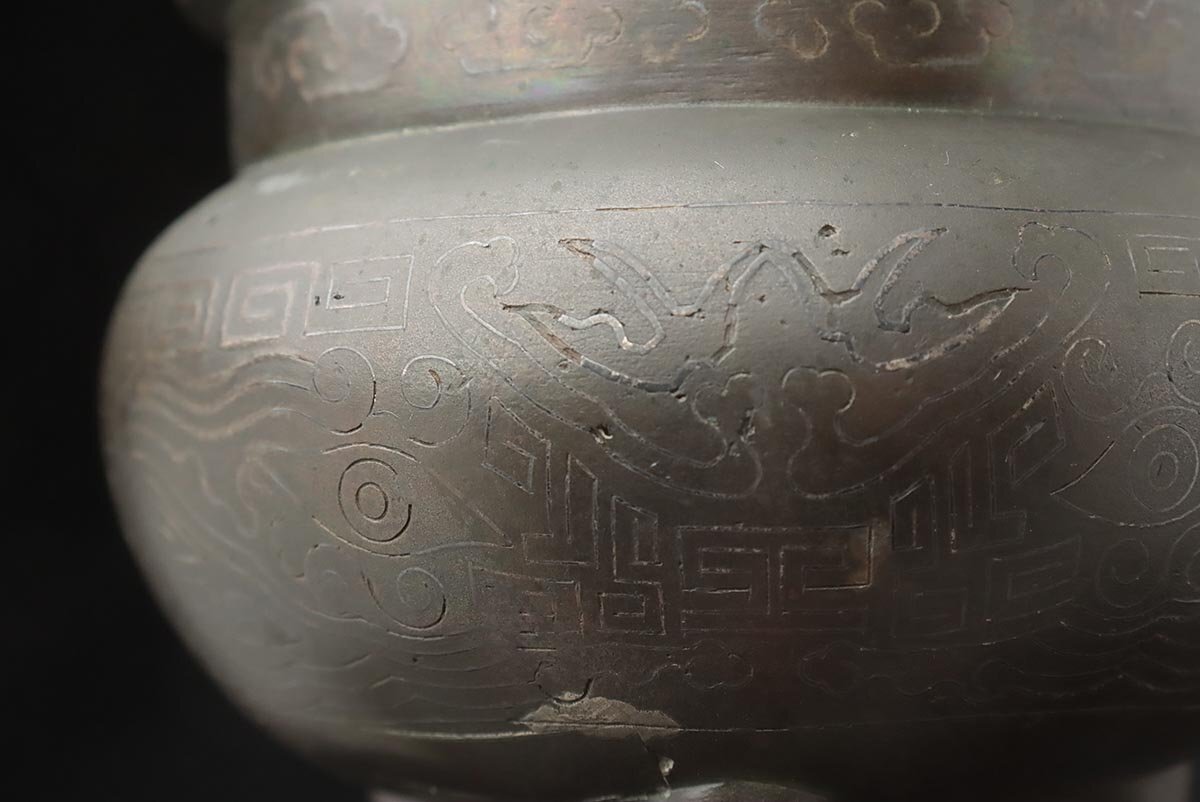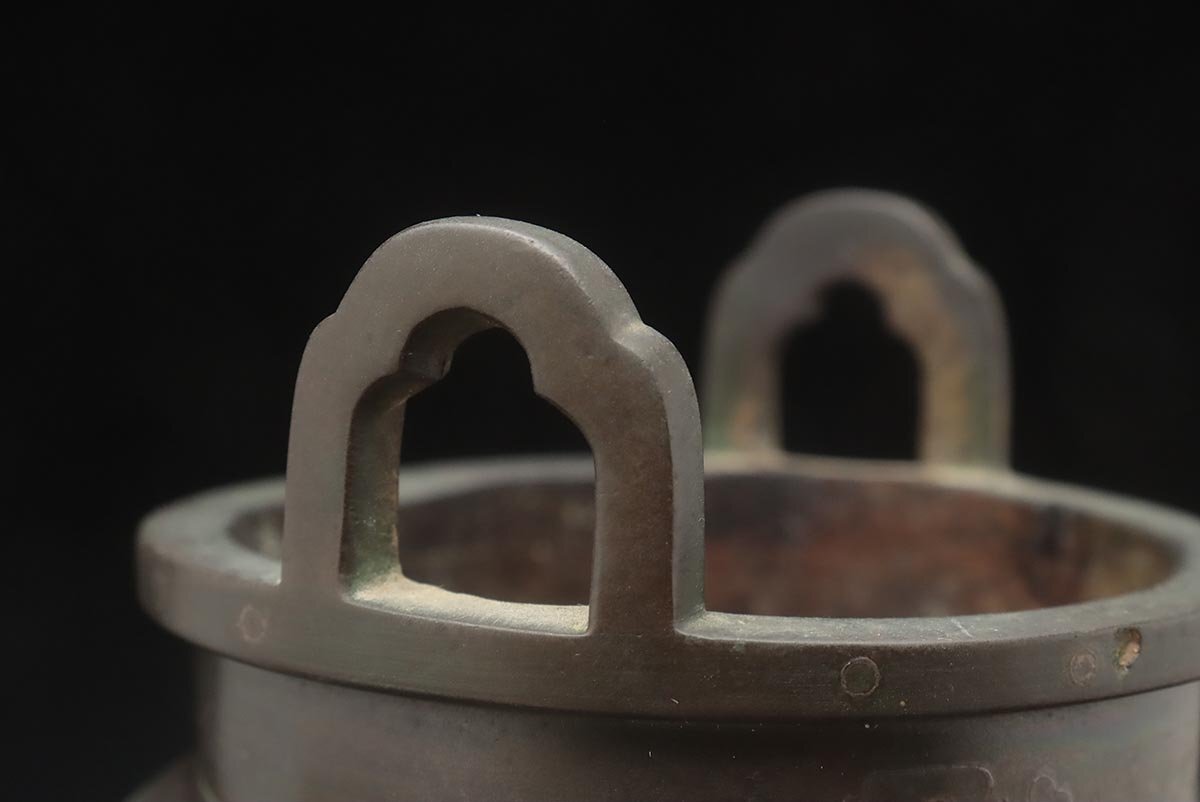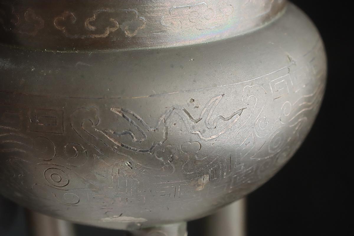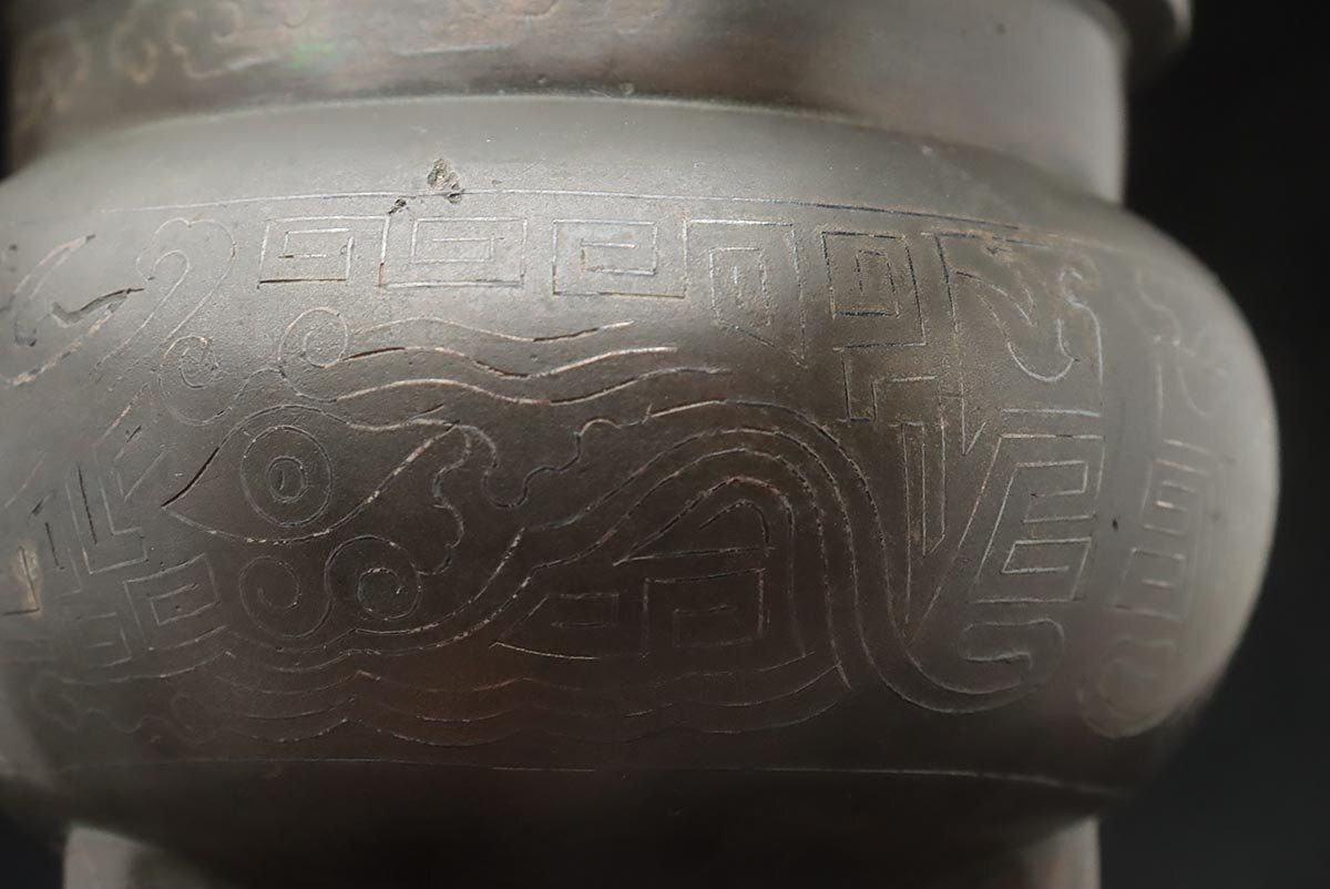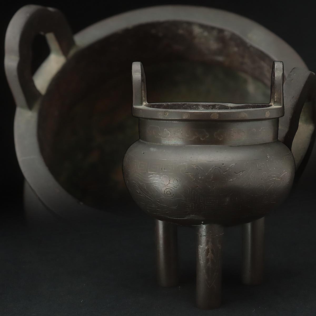 ◆ 中国美術 清時代 古銅 銅嵌銀絲饕餮紋三足鼎式炉・銅銀象嵌饕餮文双耳三足香炉 高15cm 重790g 中国古玩 検)石叟 ◆