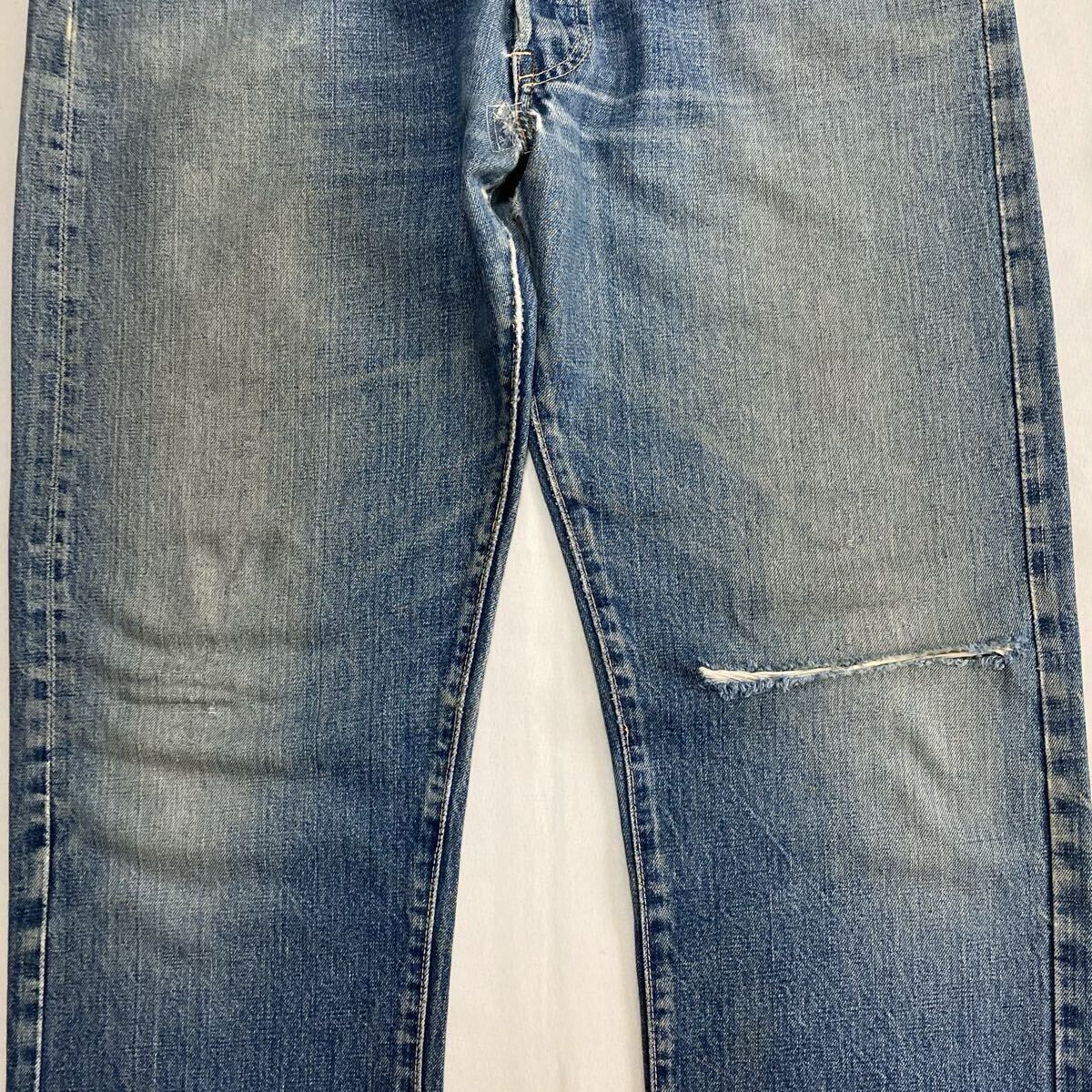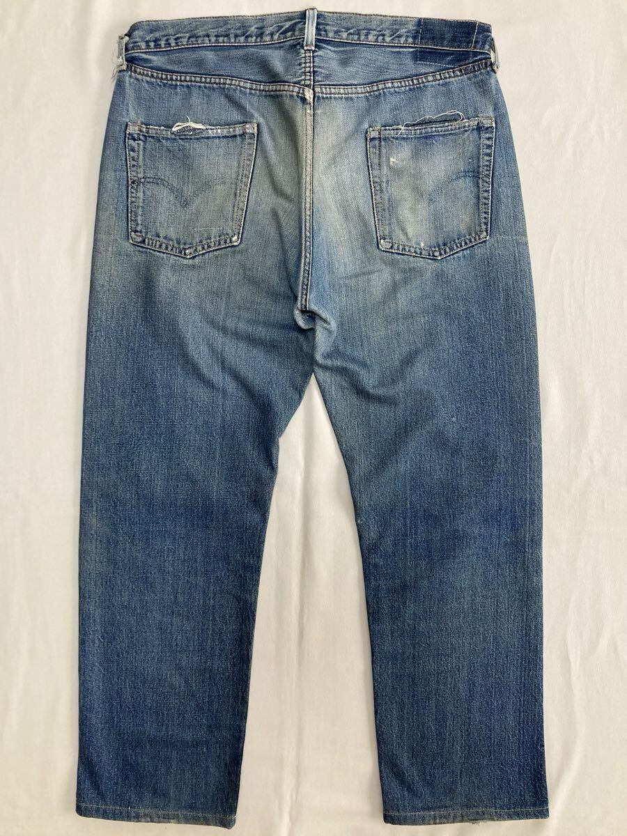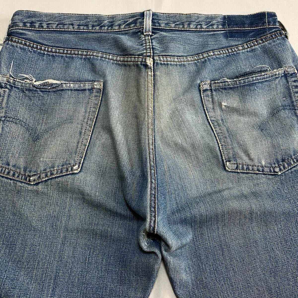 レッドタブは欠損していますが、フライボタン足長R、アウトシーム両面シングルステッチ、内タグ/スレーキスタンプ無しなどからBIGEの501になります。