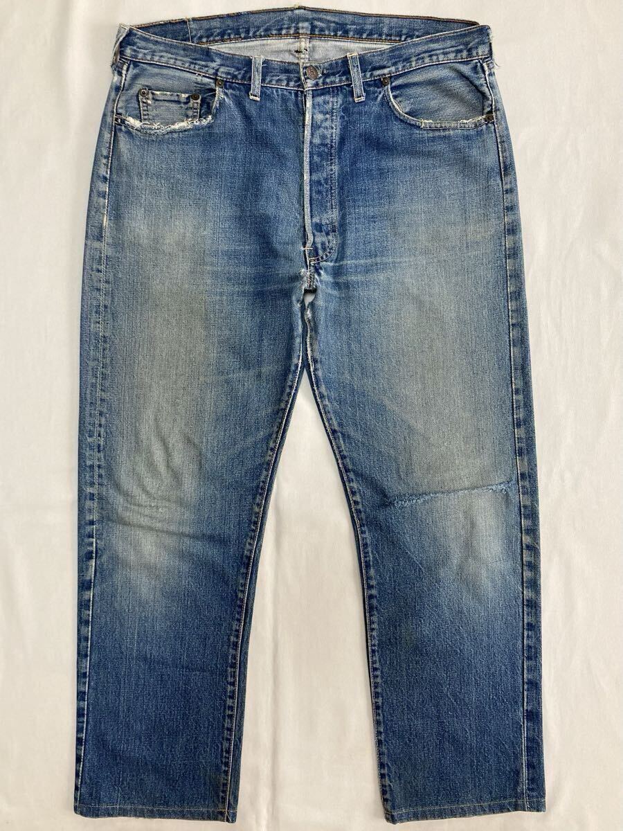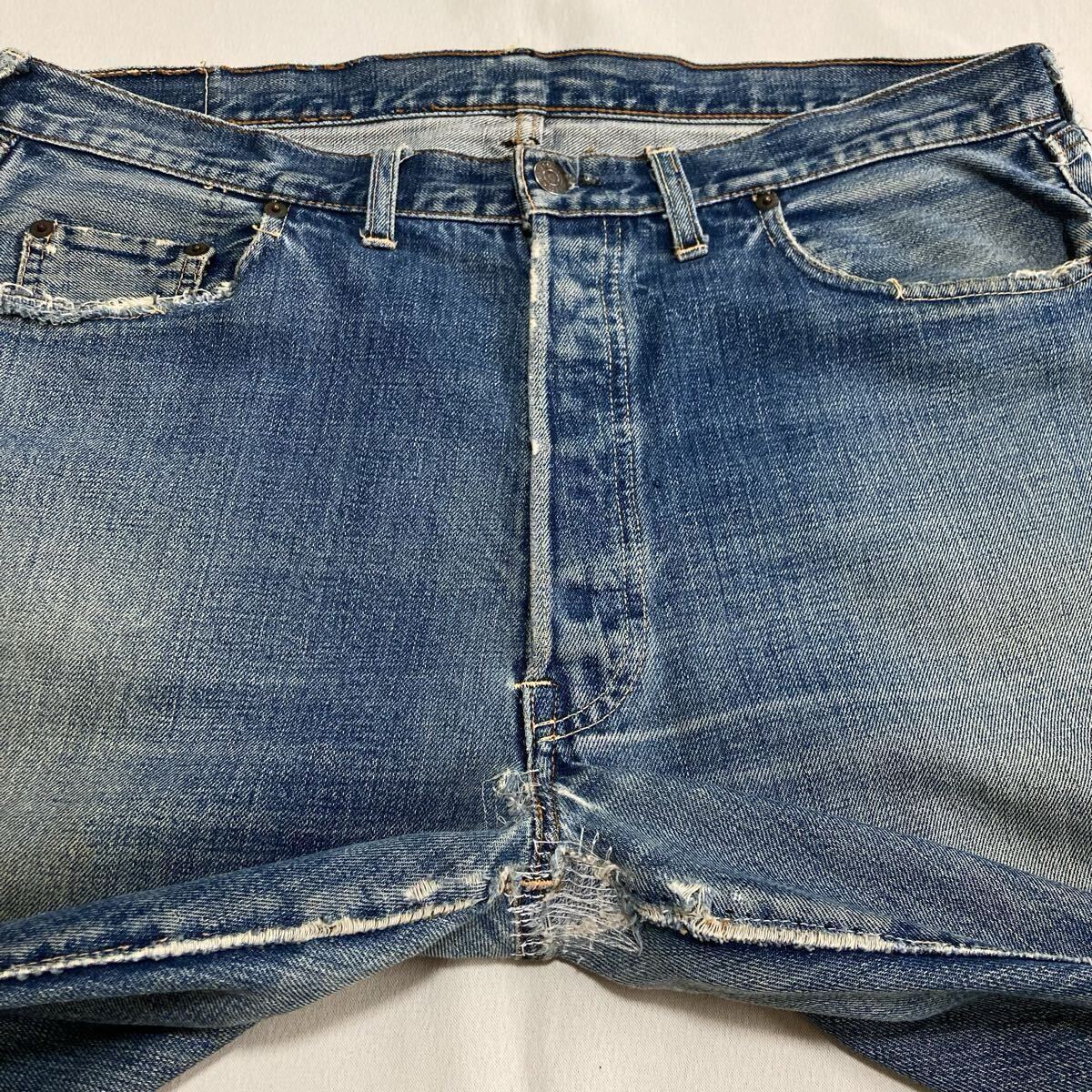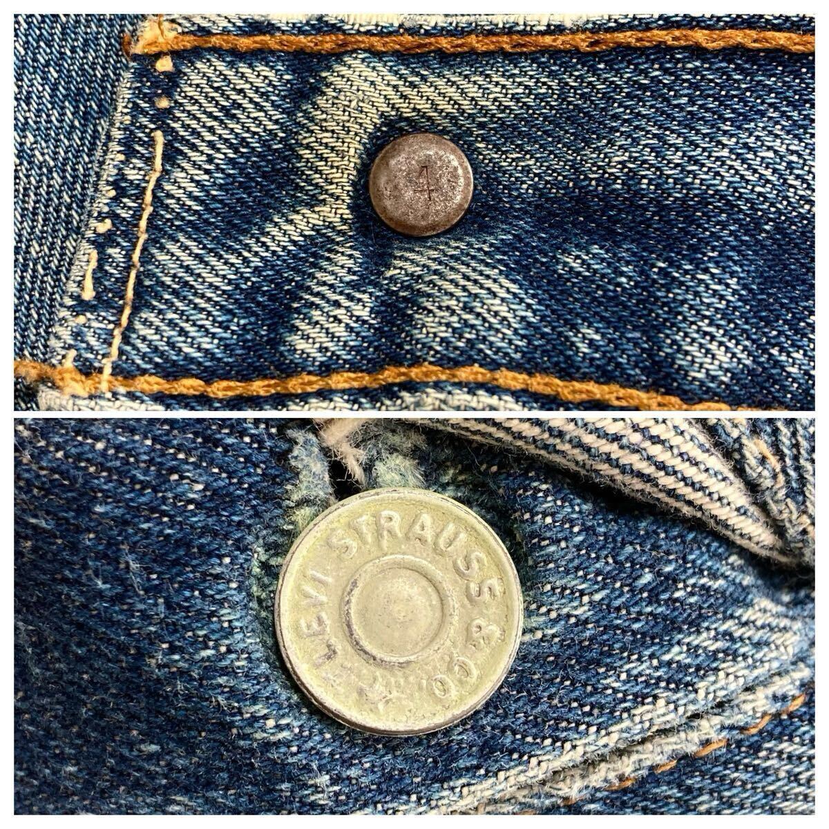 レッドタブは欠損していますが、フライボタン足長R、アウトシーム両面シングルステッチ、内タグ/スレーキスタンプ無しなどからBIGEの501になります。