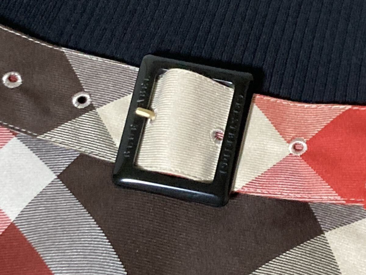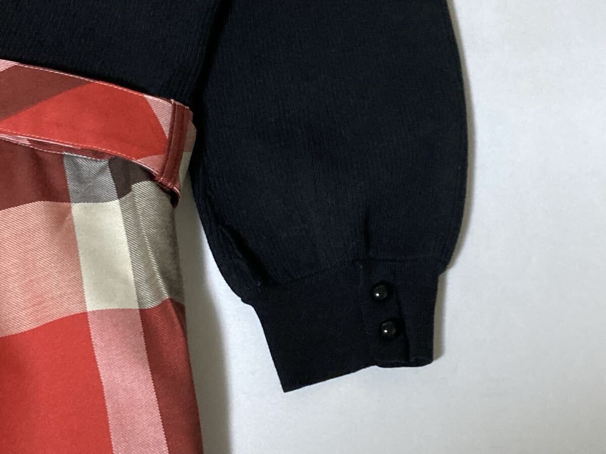ブロックチェックのスカートがクレストブリッジらしいドッキングワンピースです。上部はリブニットで、フロントセンターが少し編み柄が大きく袖口にボタンが付いたデザインです。左サイドにファスナーが付いています。ベルトのバックルにブランドロゴが刻印されています。