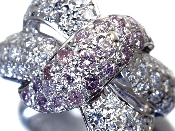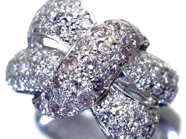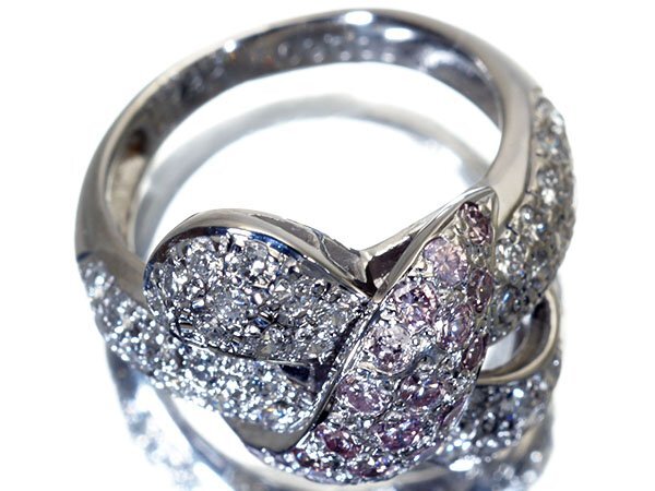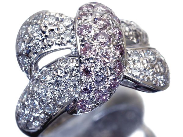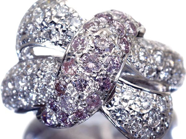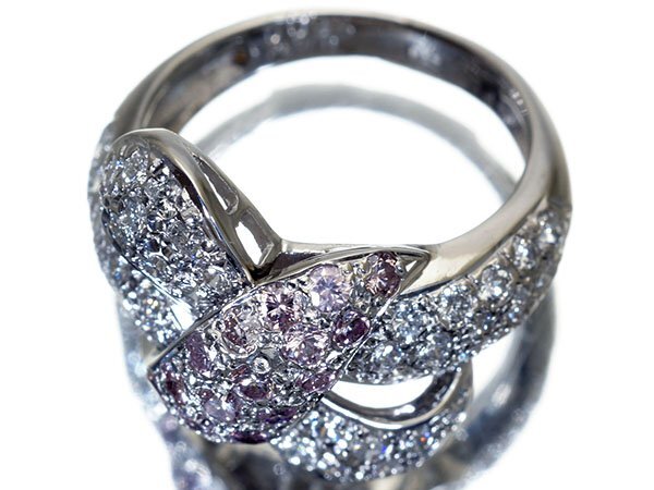 豪華なリボンデザインで美しい2色の輝き放つ超希少な極上ナチュラルピンクダイヤモンド総計0.60ct&極上クリアダイヤモンド総計0.95ctを素敵に宝飾した、超高級Pt900リングを1円から特別大放出致します!