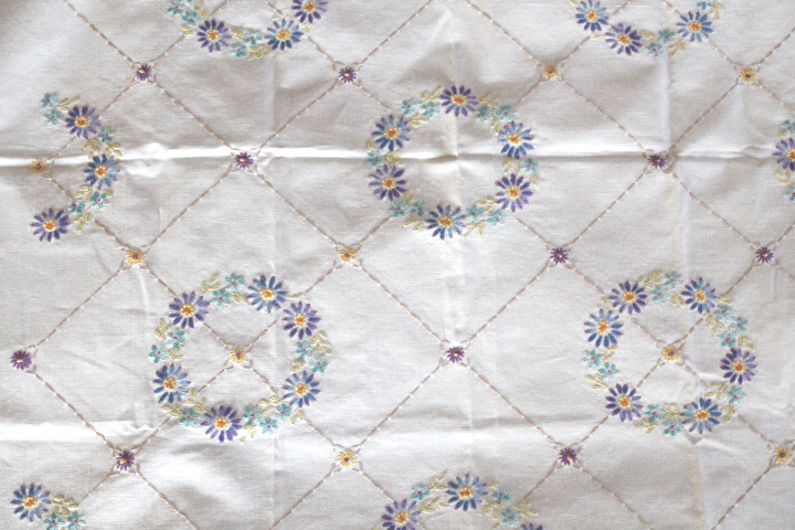 SALE !!素敵な手刺繍が一面に施された麻のテーブルクロス