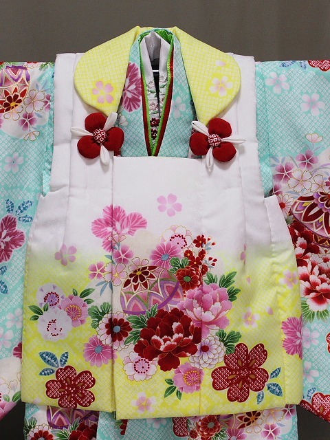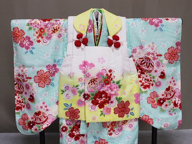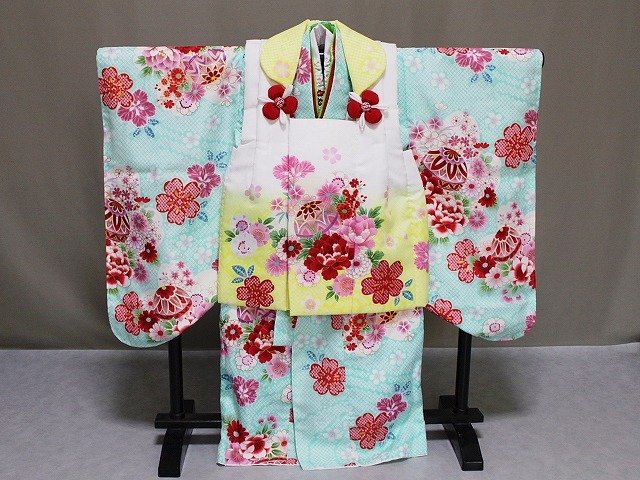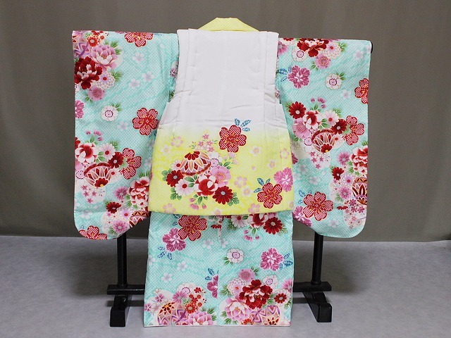 | C2388-02 塚野宇 「きょうと花ひめ」ブランドの高級ポリエステル・被布セットです。 お着物は、二段の重ね衿が付き 長襦袢にも豪華な花柄刺繍付き半衿が付いています。 草履も刺繍柄の鼻緒やかかとベルトが付き お子様が歩きやすくなっています。 お求めやすい価格となっており レンタルよりもお得ではないでしょうか。お子様の記念着物の一枚として お正月などにも着ていただけたらうれしいです。 足袋は付いておりませんが 当ショップにもございますのでお寄りくださいね。 お着物は、花柄地紋の見える淡いグリーン系色地に染絞り柄や 赤・藤色・ピンク色などにて花柄や手まりなどの柄があり 所々金色にて縁取り加工も見られます。重ね衿は赤色とみどり色が付いています。 被布は、花柄地紋の見える白色にグラデーションが入り 絞り柄や赤・白・藤色系の色などにて花柄や手まりなどの柄があり 所々金色にて縁取り加工も見られます。◎ | ||||||||||