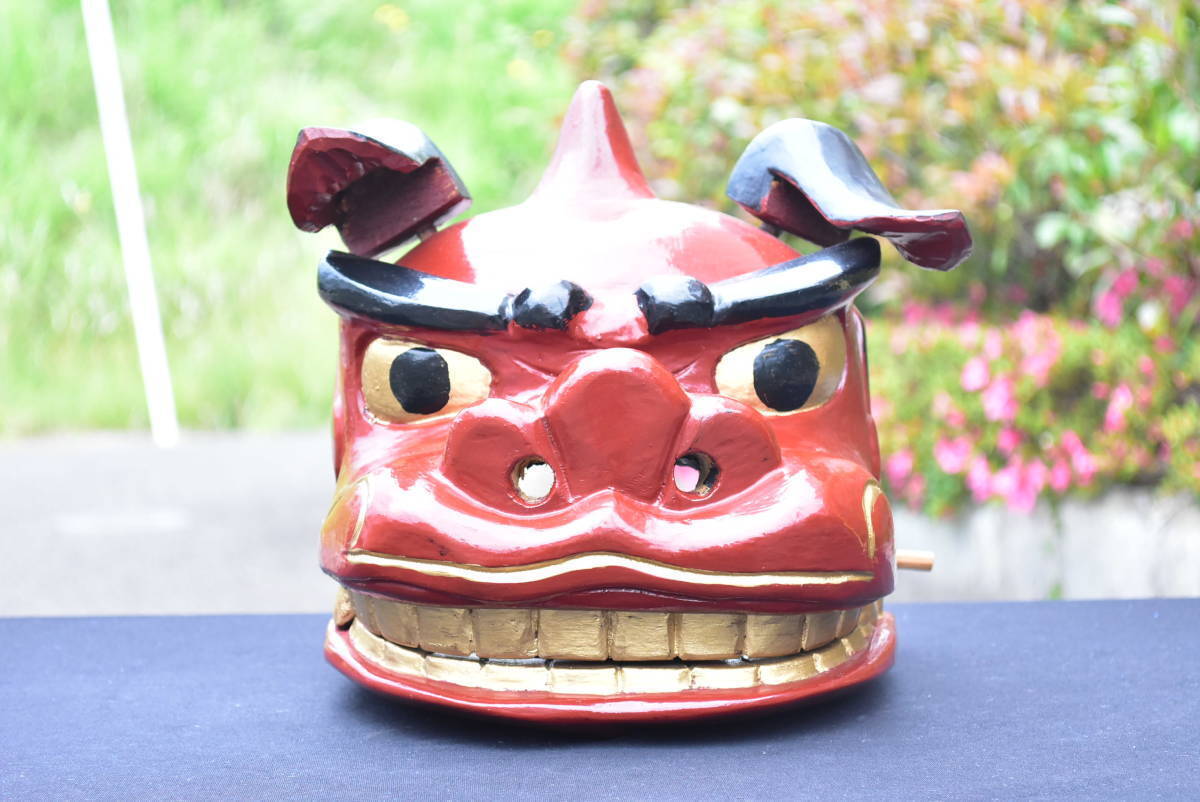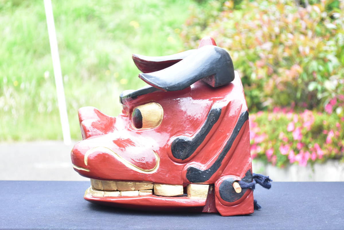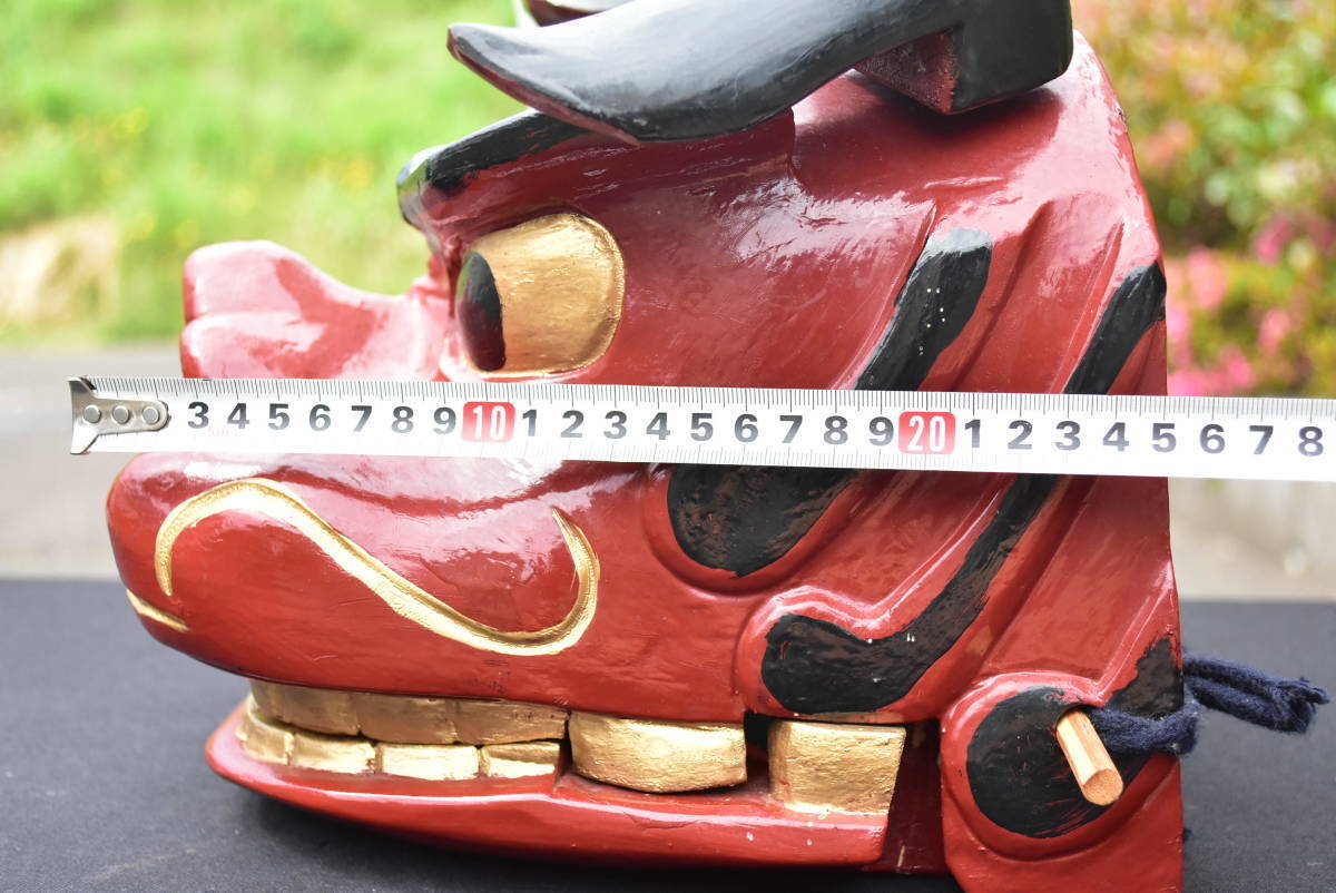 獅子舞 獅子頭 木彫り 横23cm 高さ26cm 奥行き26cm 重さ2kg 神楽面 祭礼 神具 昭和期