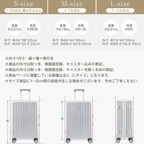 • 【S 1~3日宿泊 機内持込 】外寸:約54*38*23cm 内寸:約49*34.5*23cm 重量:約3.51kg 容量:約38.8L 【ご注意】①掲数している写真は、ご使用のコンピューター及びスマホのモニターの種類によって、実際の商品のイメージと多少異なることがございます。予めこ了承ください。②ロットによって、製品の色は多少異なりますので、こ了承とこ理解の程よるしくお願いたします。