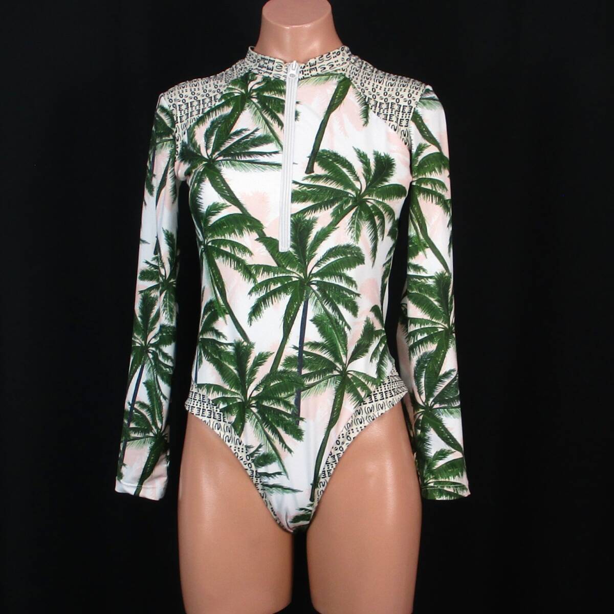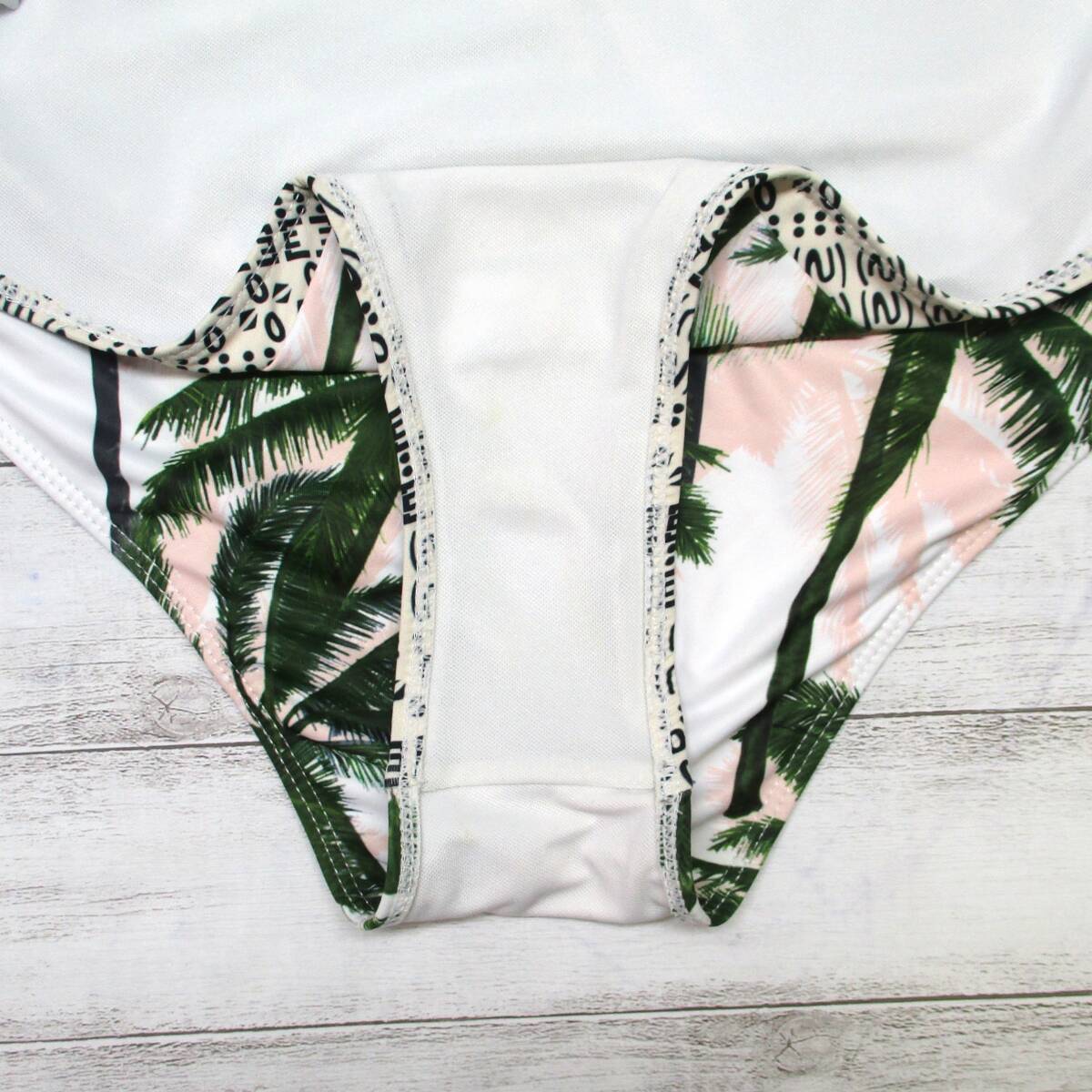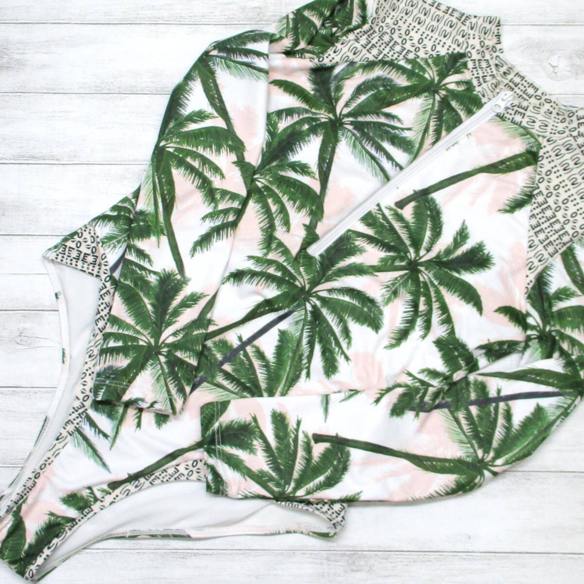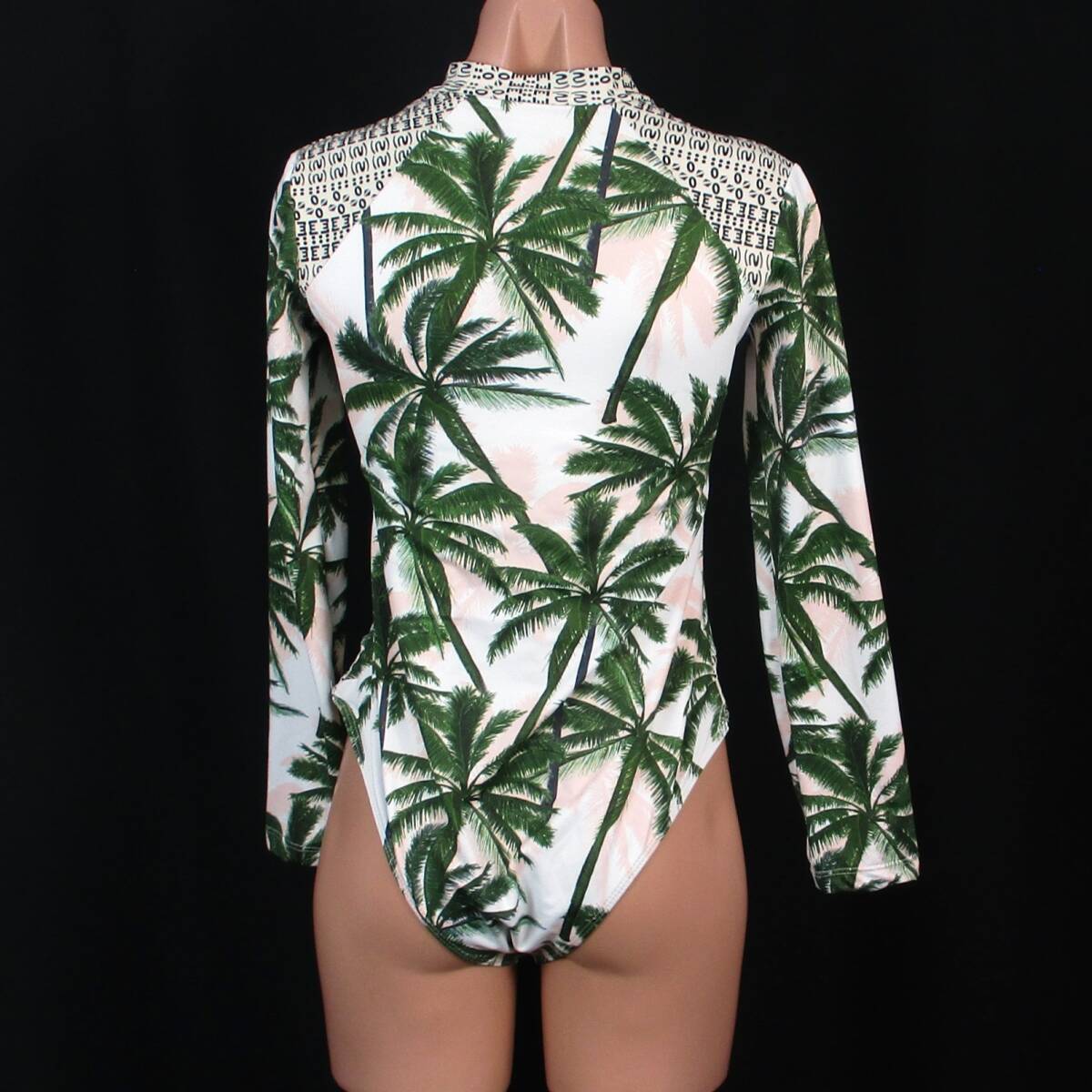 C6074★長袖ラッシュガード 大きいサイズ レディースL ハイレグ ジッパー ヤシの木 ワンピース水着 リゾート柄 つるすべ 白 ビーチ プール