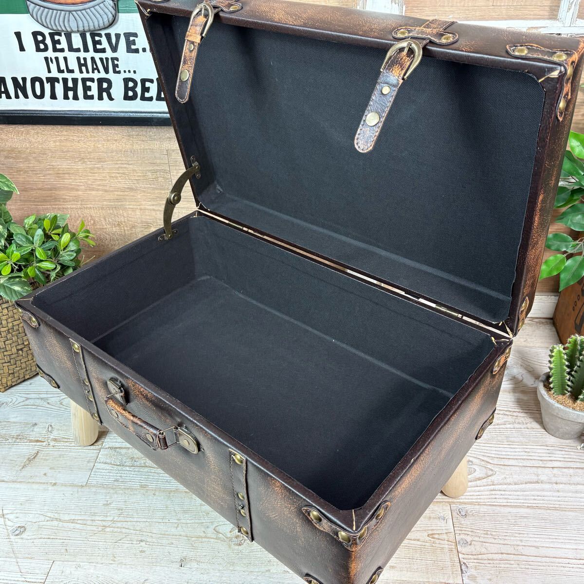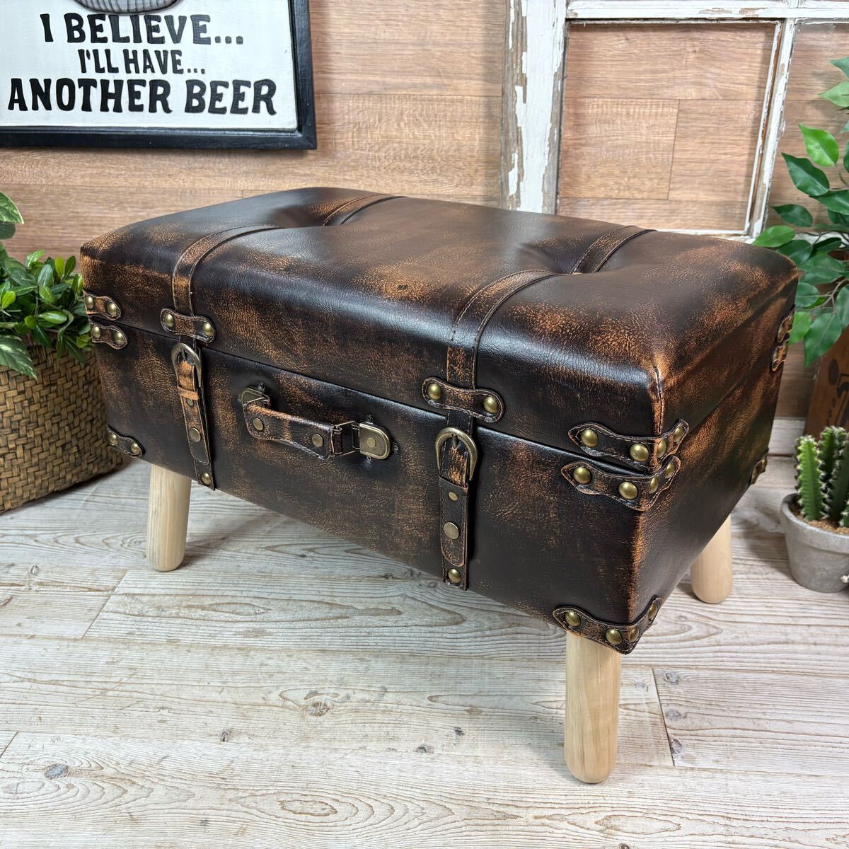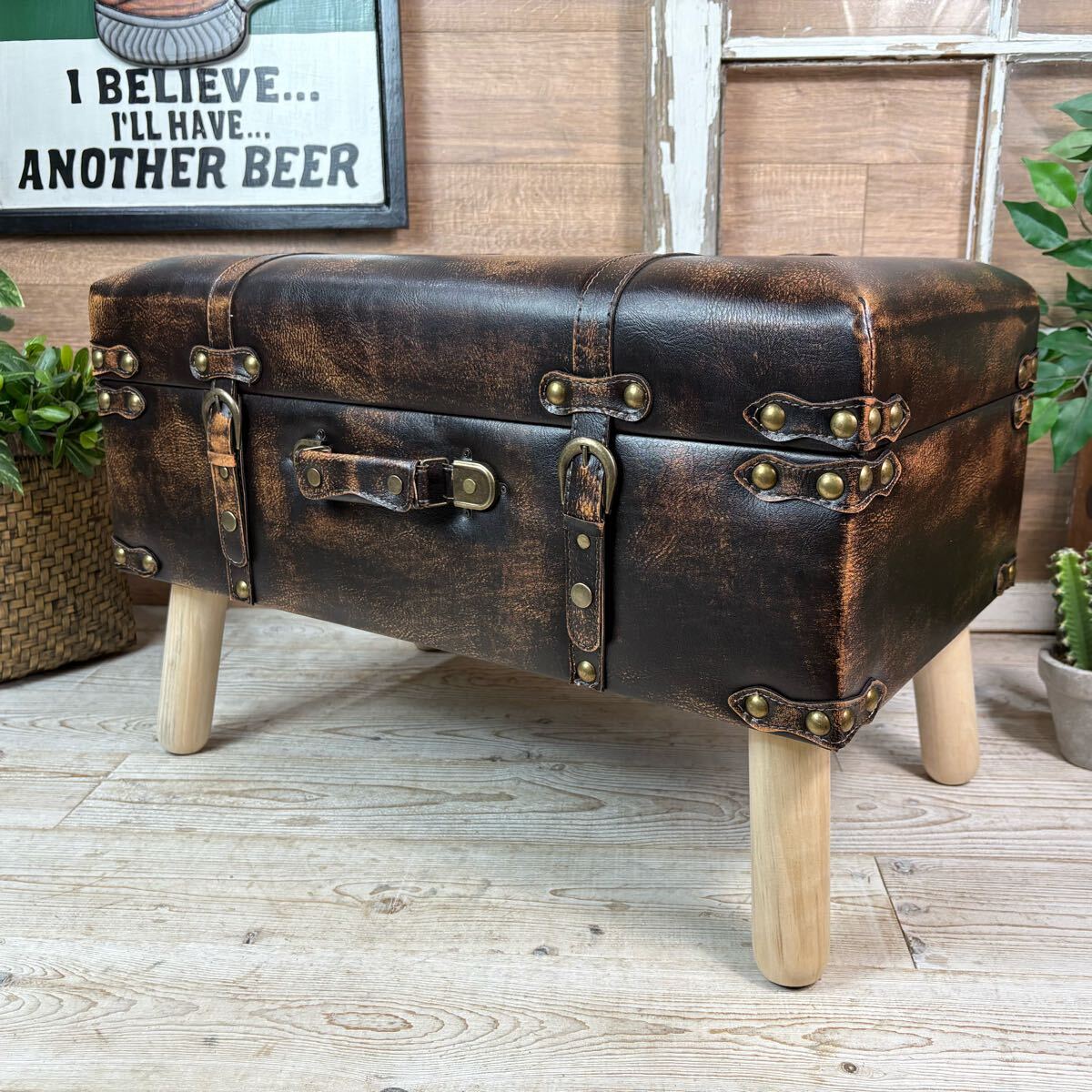 アンティークビンテージデザインの素敵なレザースツールです。座面部分にはふかふかクッション入りで座り心地の良い品です。トランク型の収納スペース付きで、ケース、ボックス、小物収納にも最適です。ナチュラルウッド木製の足がおしゃれなお品!今大注目の男前インテリアにぴったりなな一品です♪レザー張りならではの質感がシックで抜け感のあるデザインです。大人インテリアの雰囲気アップに役立ちそうですね。アンティーク、ヴィンテージの風合いもお楽しみいただけます。玄関先の椅子、キッチンの腰掛け、ソファオットマン、ショップのディスプレイ、様々な場面で大活躍です♪ほかでは買えないこの機会にぜひ(^-^)