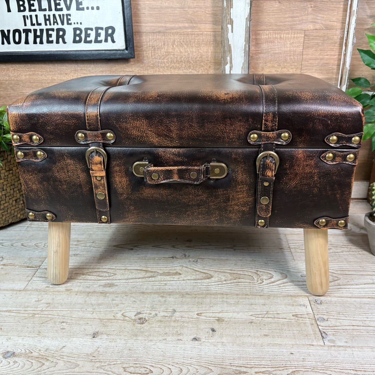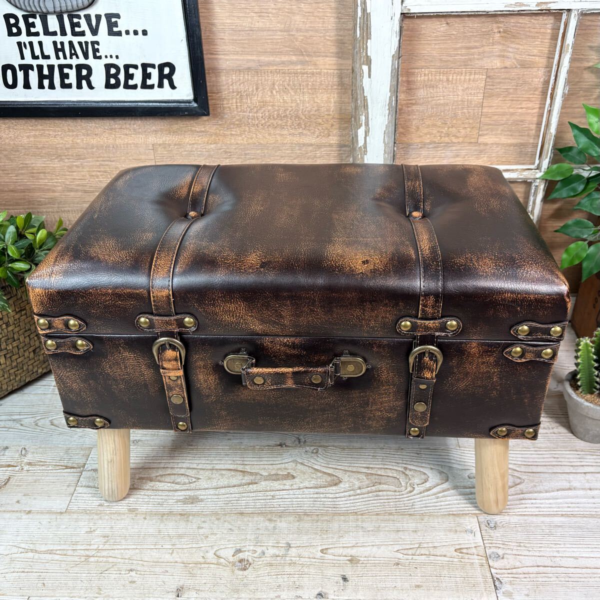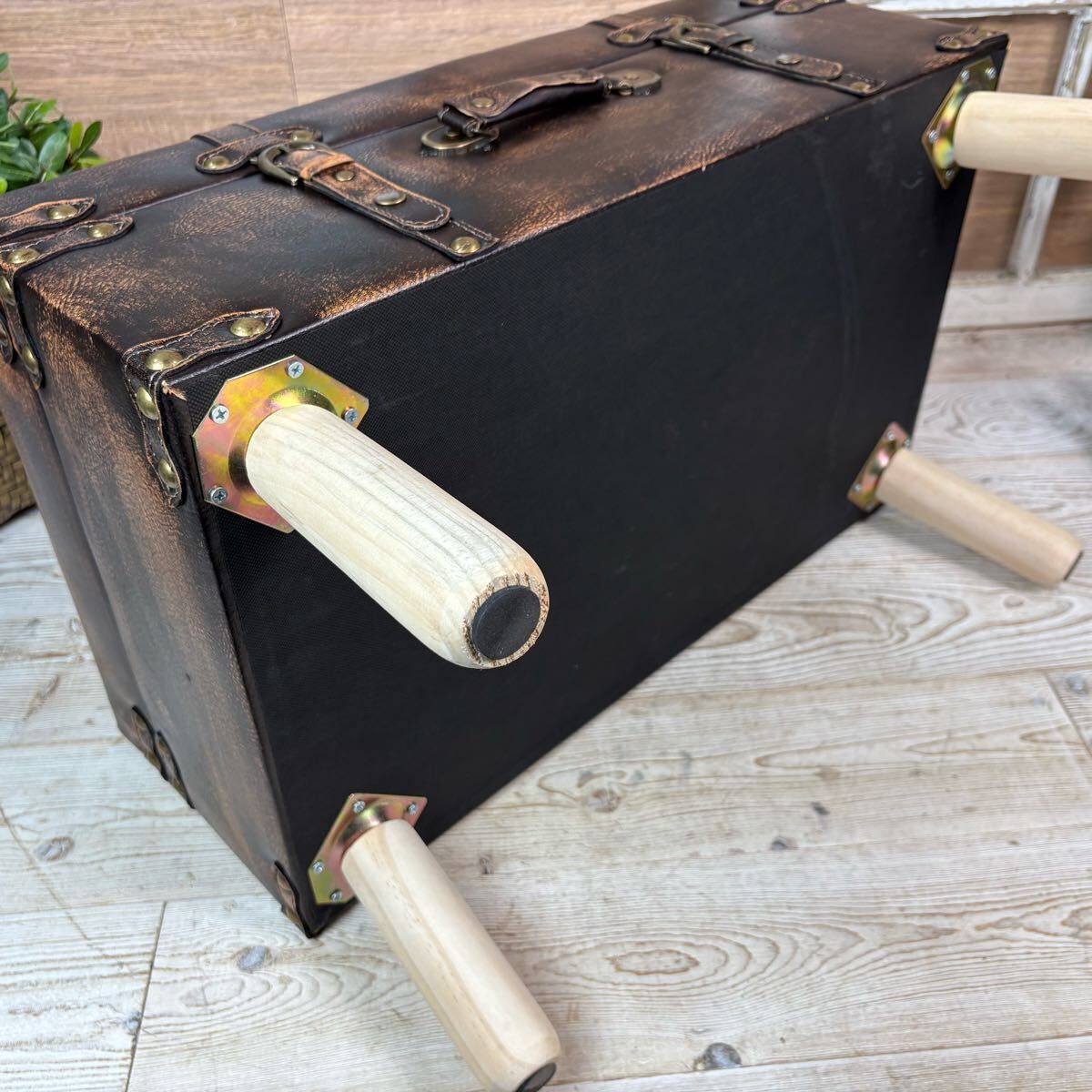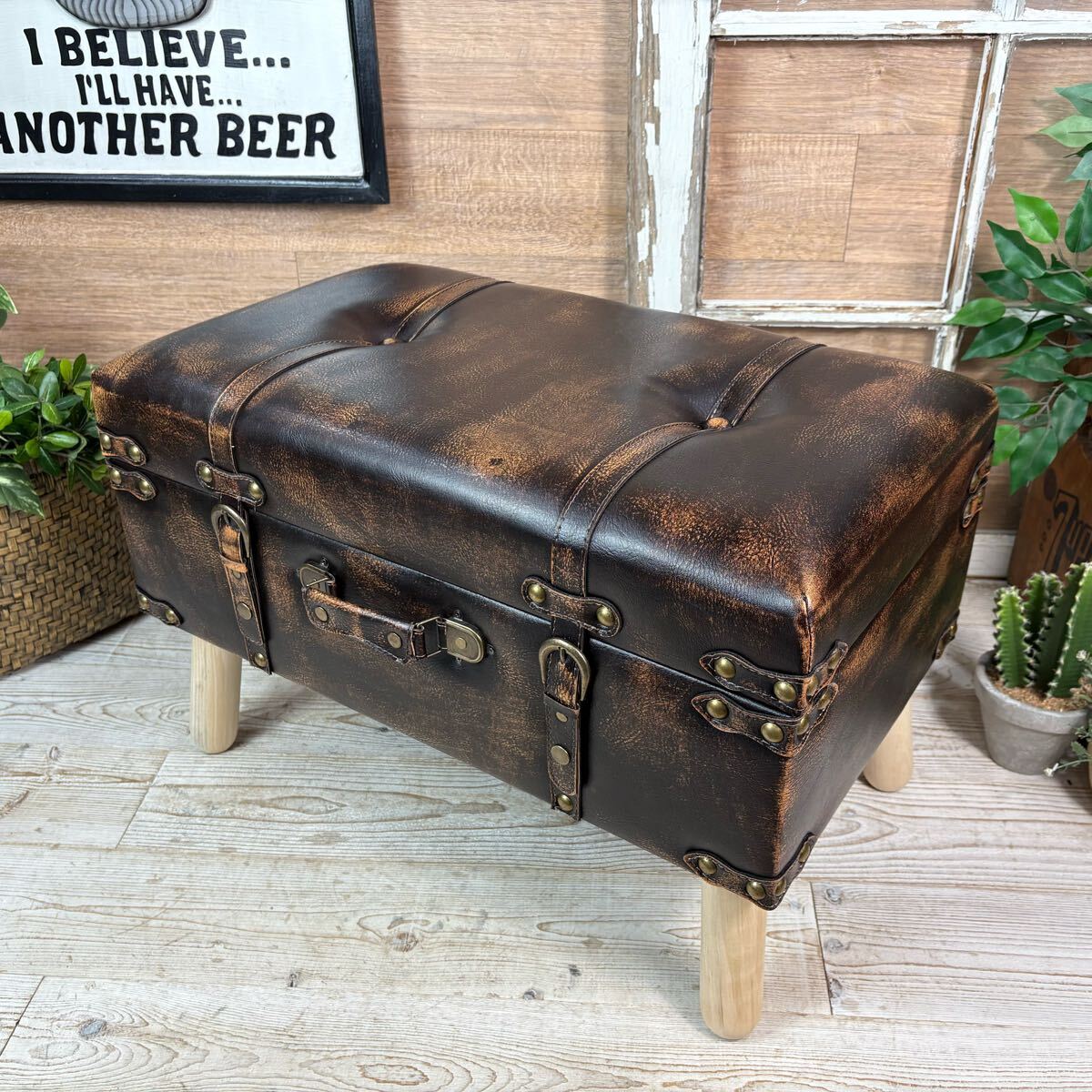 アンティークビンテージデザインの素敵なレザースツールです。座面部分にはふかふかクッション入りで座り心地の良い品です。トランク型の収納スペース付きで、ケース、ボックス、小物収納にも最適です。ナチュラルウッド木製の足がおしゃれなお品!今大注目の男前インテリアにぴったりなな一品です♪レザー張りならではの質感がシックで抜け感のあるデザインです。大人インテリアの雰囲気アップに役立ちそうですね。アンティーク、ヴィンテージの風合いもお楽しみいただけます。玄関先の椅子、キッチンの腰掛け、ソファオットマン、ショップのディスプレイ、様々な場面で大活躍です♪ほかでは買えないこの機会にぜひ(^-^)