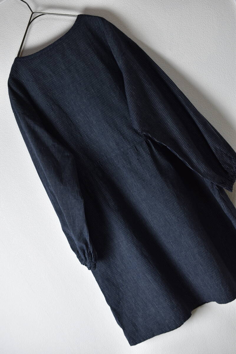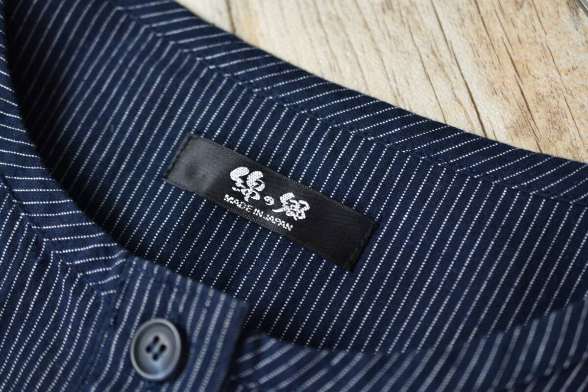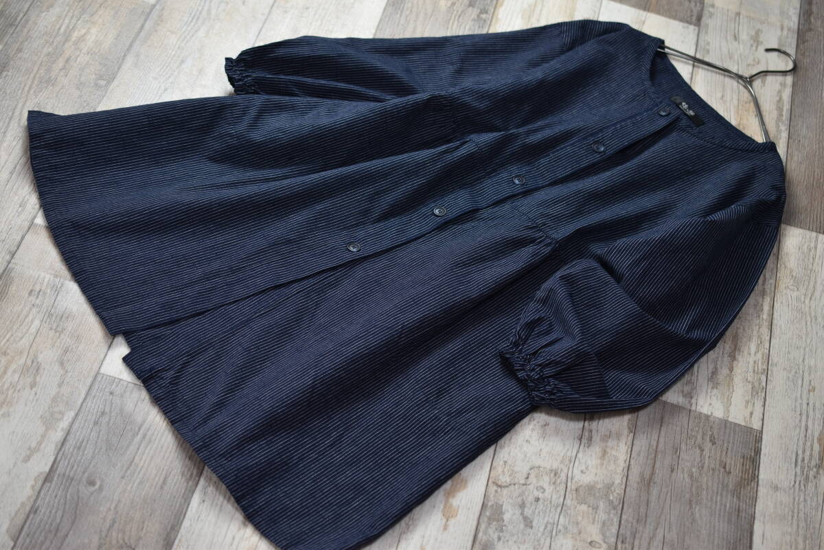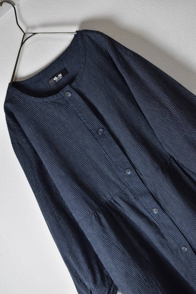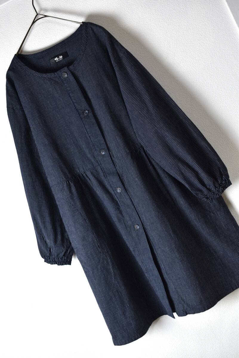 綿の郷 日本製 ストライプ柄ノーカラーコットンブラウスチュニック 紺色